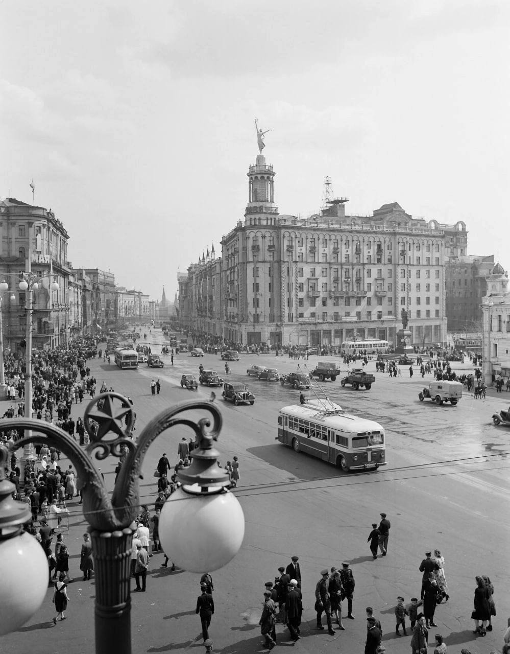 Старое фото: на ротонде дома на пересечении Тверской улицы и бульвара в Москве раньше красовалась скульптура девушки. Сначала мне показалось, что это балерина. Потом рассмотрел, что в руке у нее серп и молот.