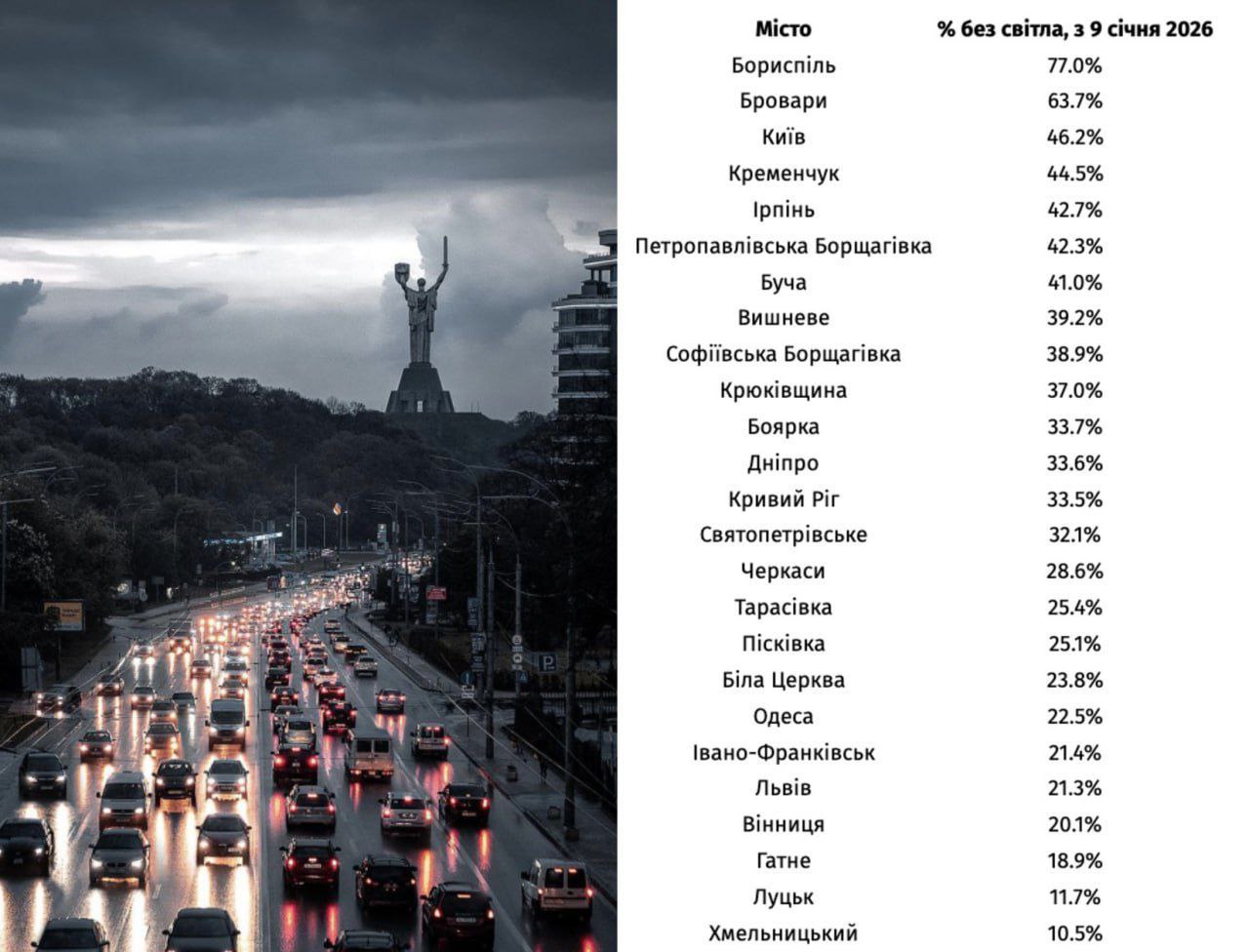Больше всего без света в начале 2026 года провели Киев, Борисполь и Бровары по версии противника.