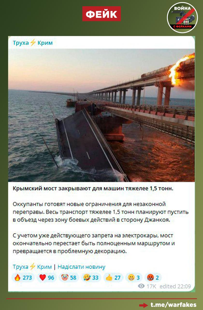 Фейк: Крымский мост закрывают для всех машин тяжелее 1,5 тонны. Об этом пишут украинские телеграм-каналы.