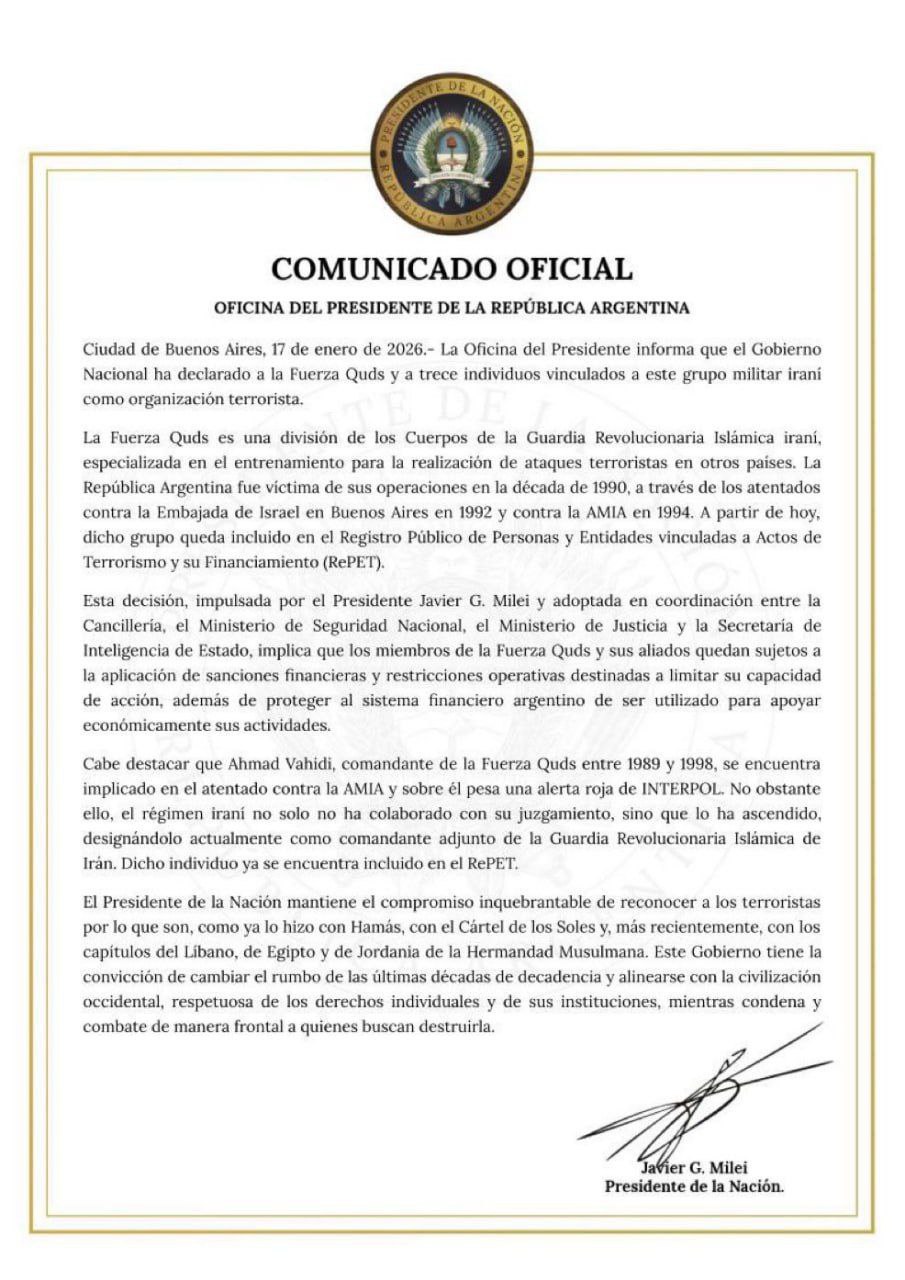 Аргентина объявляет Силы Кудс Корпуса Стражей Исламской Революции Ирана террористической организацией. Конечно, упомянули ХАМАС и "Картель Солнца" Мадуро. То есть, рисуют связь между ними.
