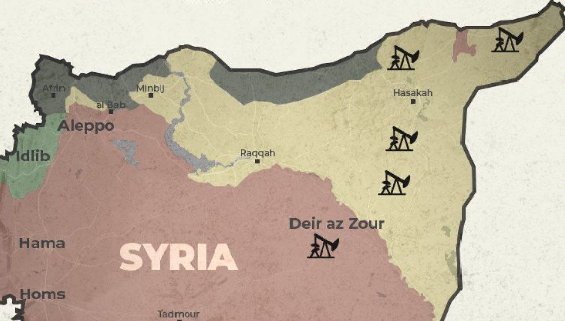 По удивительному совпадению большая часть сирийской нефти находится на подконтрольных курдам и СДС территориях, а охрана и персонал США обслуживает до 80% крупнейших месторождений, аккуратненько выводя колонны цистерн с нефтью в неизвестном направлении через границу с Ираком.