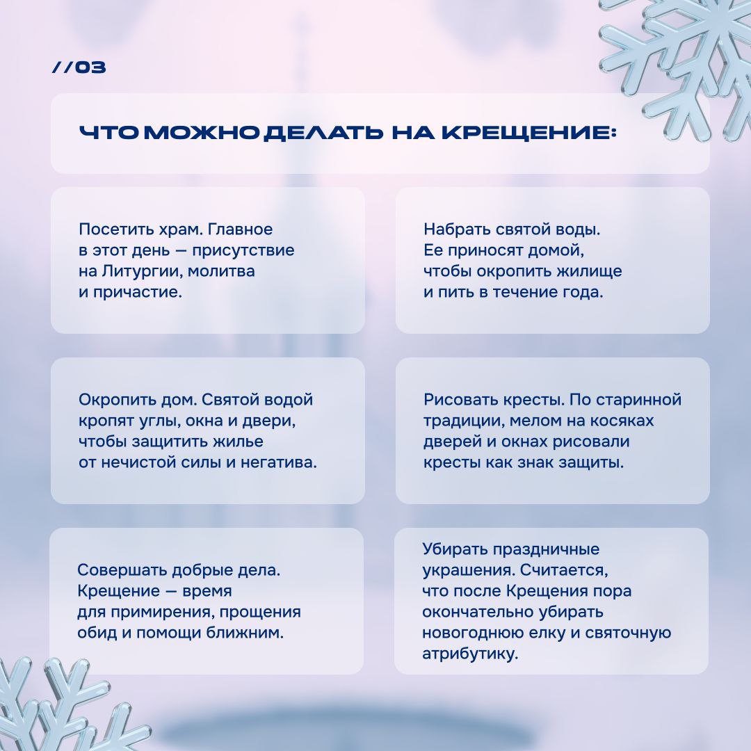 Крещение Господня отмечают 19 января. Народные традиции, приметы и что можно и нельзя делать — рассказываем в карточках