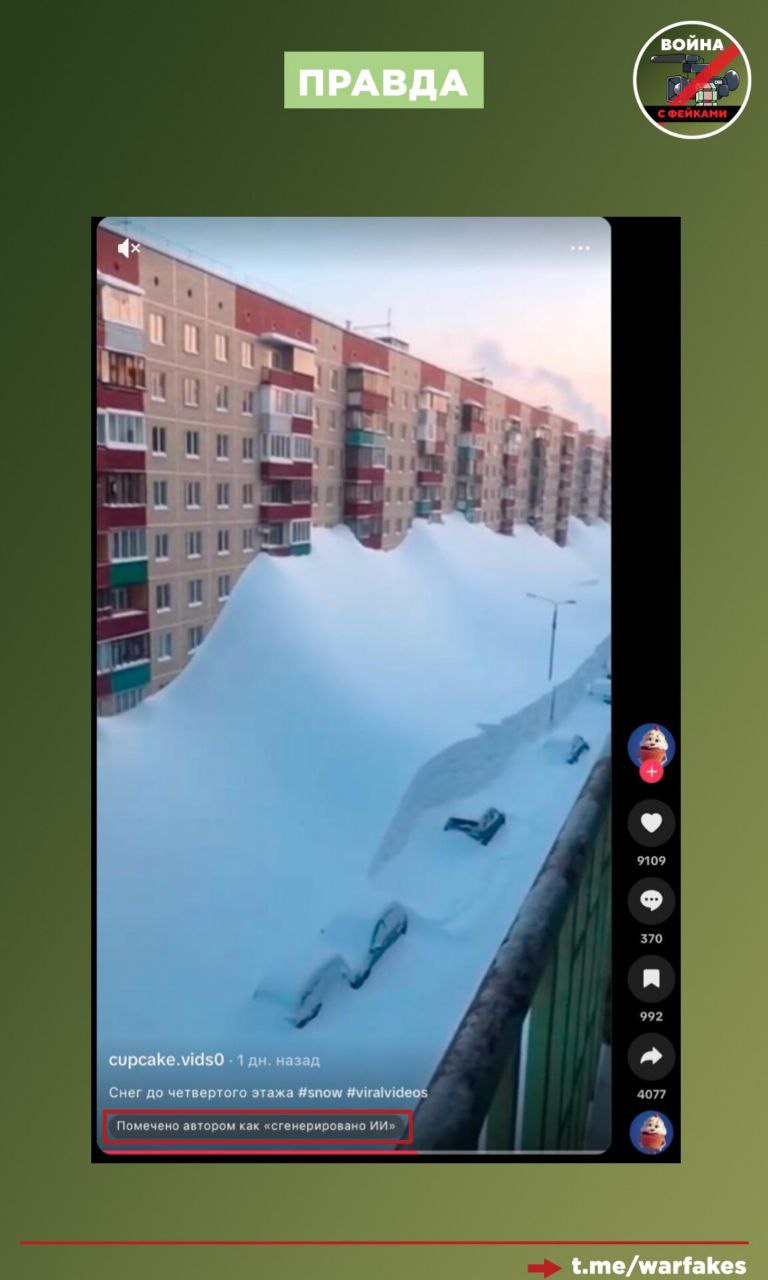 Забавно, что на канале пользователя TikTok присутствует видео с сугробами около панелек с бесконечным количеством этажей. Советуем телеграм-каналам проверять информацию перед публикацией, если не при помощи специальных инструментов, то хотя бы руководствуясь логикой.