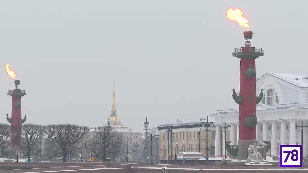 Факелы на Ростральных колоннах зажглись — они будут гореть до полудня. Факелы вновь загорятся сегодня с 19 до 22 часов.