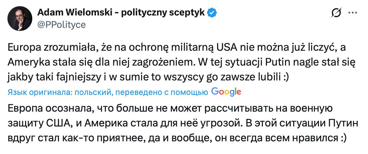 «Европа осознала, что больше не может рассчитывать на военную защиту США и Америка стала для неё угрозой. В этой ситуации Путин вдруг стал как-то приятнее, да и вообще, он всегда всем нравился :)».