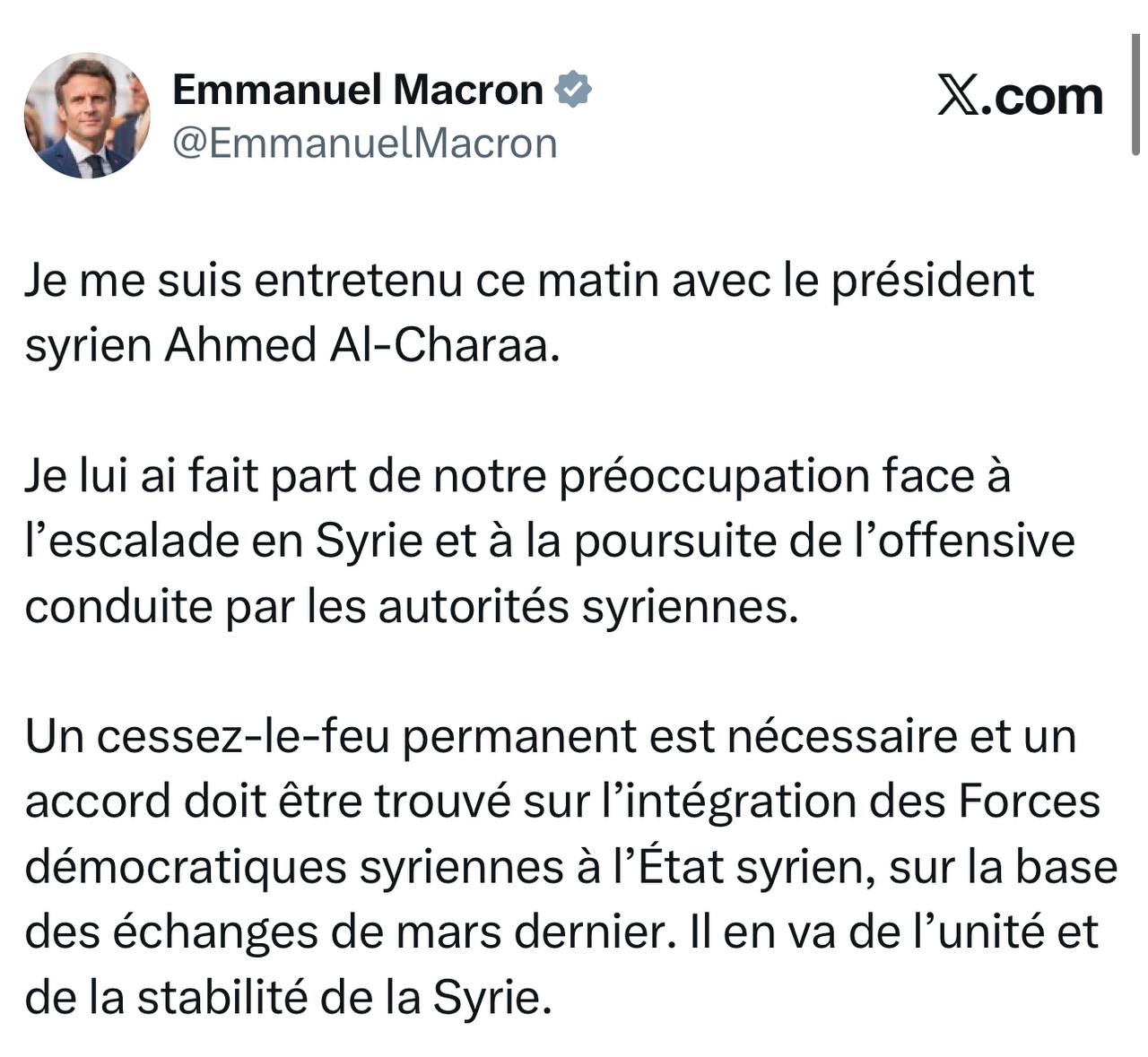 Президент Франции Макрон: «Сегодня утром я разговаривал с президентом Сирии Ахмедом аш-Шараа.
