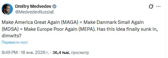"Сделаем Америку великой снова (MAGA) = Сделаем Данию маленькой снова (MDSA) = Сделаем Европу бедной снова (MEPA). Эта идея дошла до вас только сейчас, глупцы?".