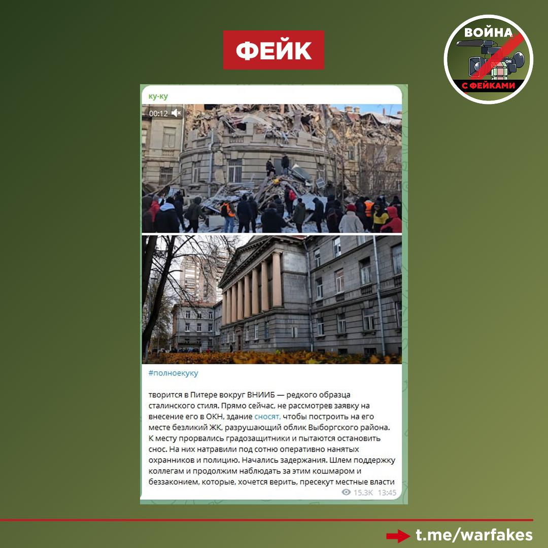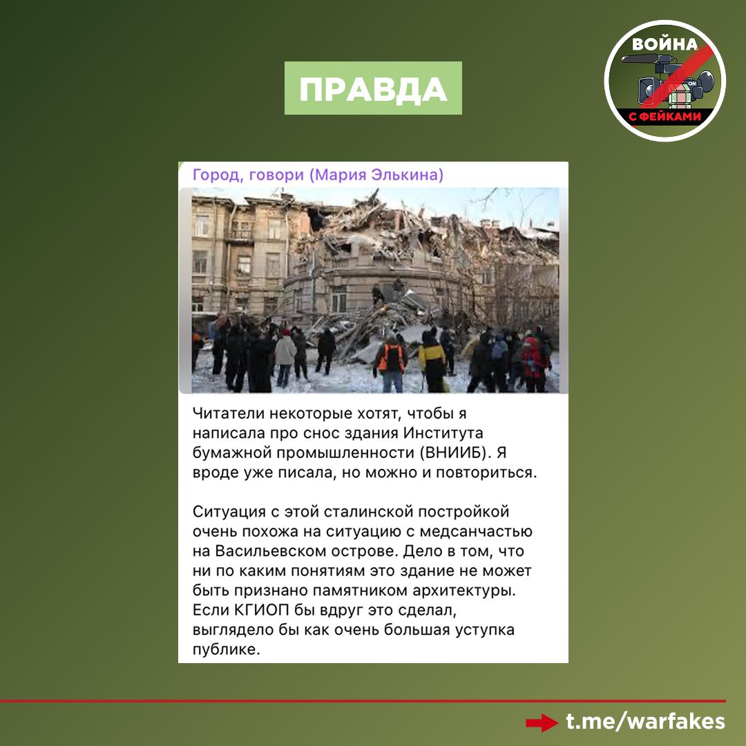 Фейк: Демонтированное здание ВНИИ целлюлозно-бумажной промышленности в Санкт-Петербурге являлось уникальным памятником архитектуры. Об этом пишут оппозиционные ресурсы и телеграм-каналы иноагентов.