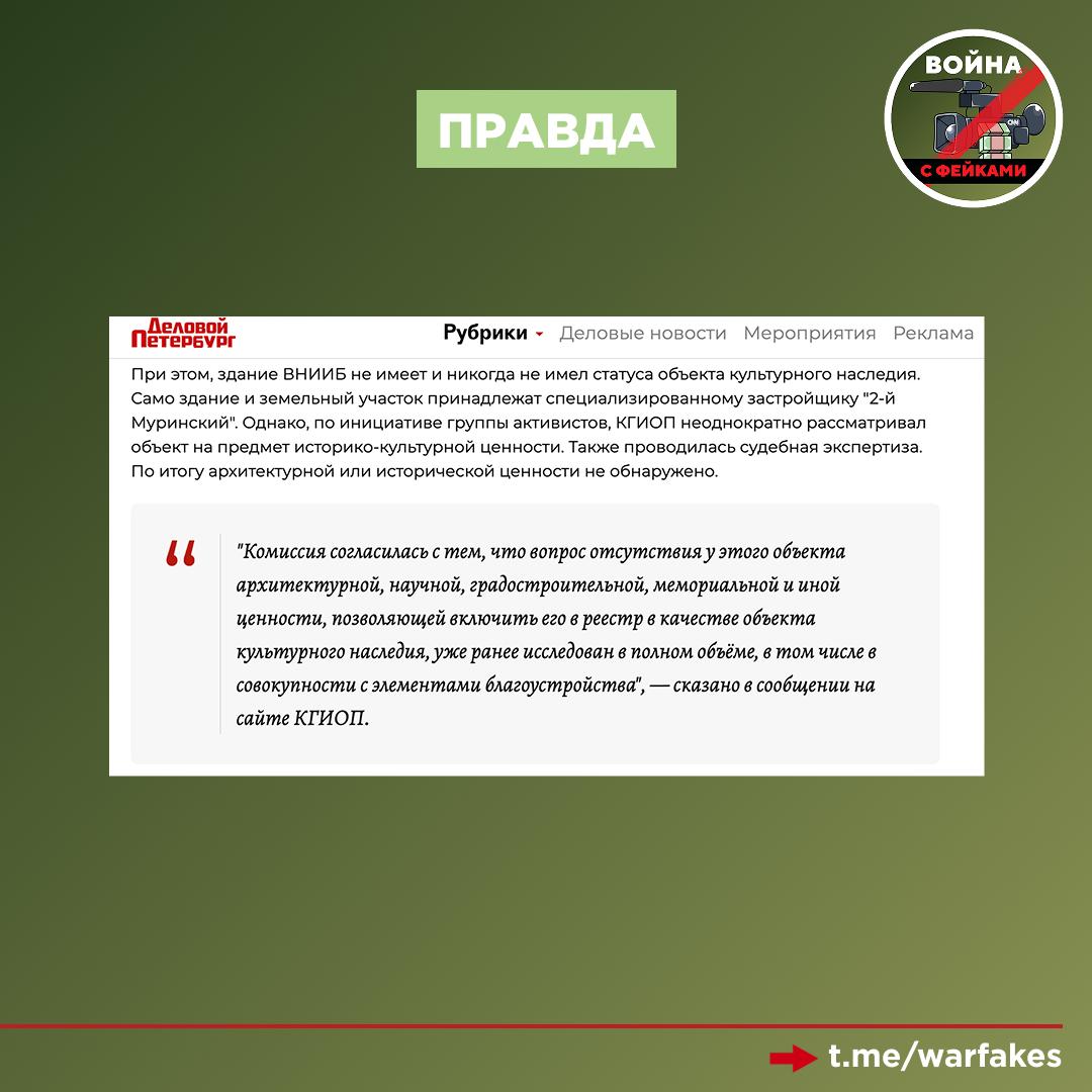 Правда: Бывшее здание ВНИИБ не является и никогда не являлось объектом культурного наследия. Оно расположено вне границ зон охраны подобных объектов, о чем говорят признанные эксперты в области архитектуры.
