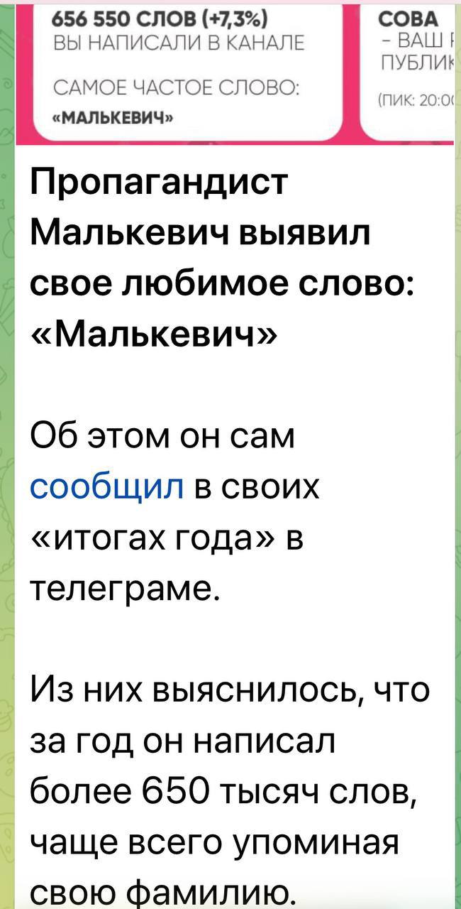 Ну, логично ведь, что в канале у Малькевича самым популярным словом стало «Малькевич». Видимо, написать больше и не о чем. Название у него такое, а в конце каждого поста ссылка есть с фамилией – чтобы при репостах людям удобно было подписываться сразу))