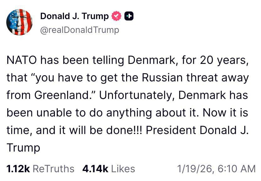 Трамп заявил, что настал момент «убрать российскую угрозу от Гренландии».«НАТО на протяжении двух десятилетий говорило Дании: вы должны устранить российскую угрозу в районе Гренландии. К сожалению, Дания с этим не справилась. Теперь пришло наше время — и этот вопрос будет решён», — подчеркнул он.