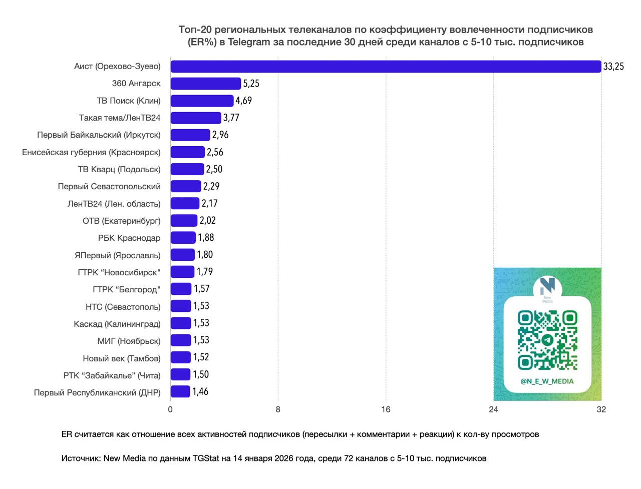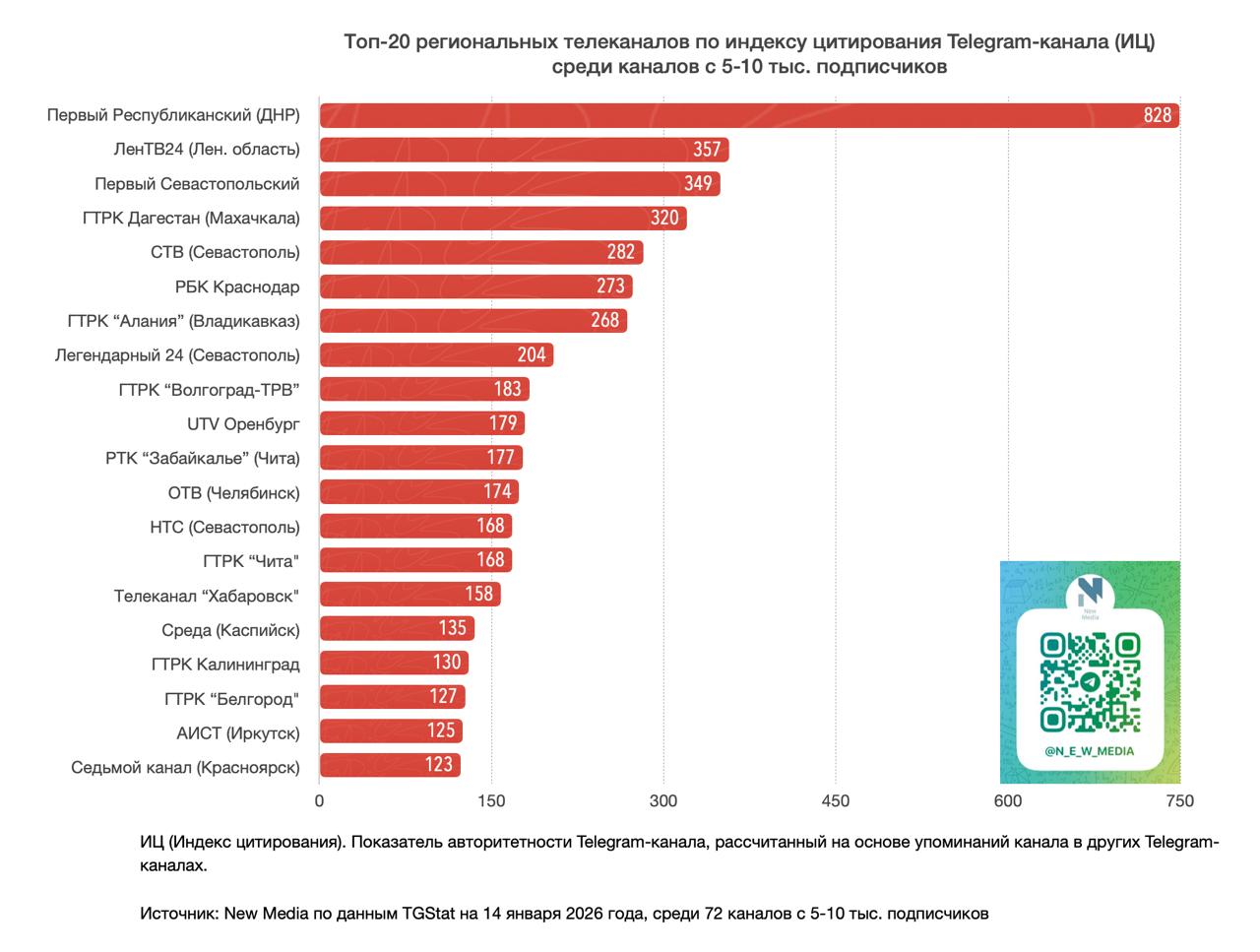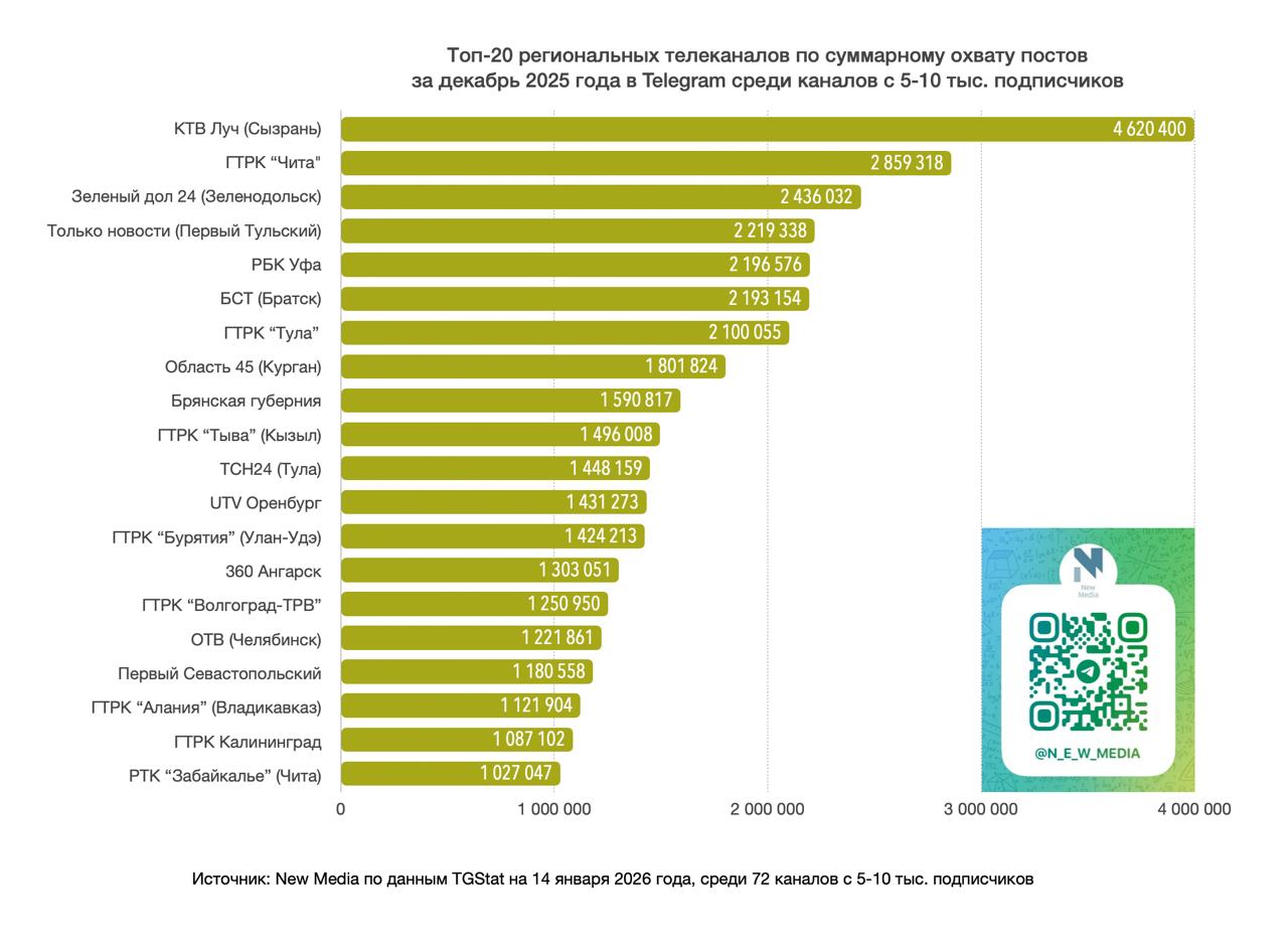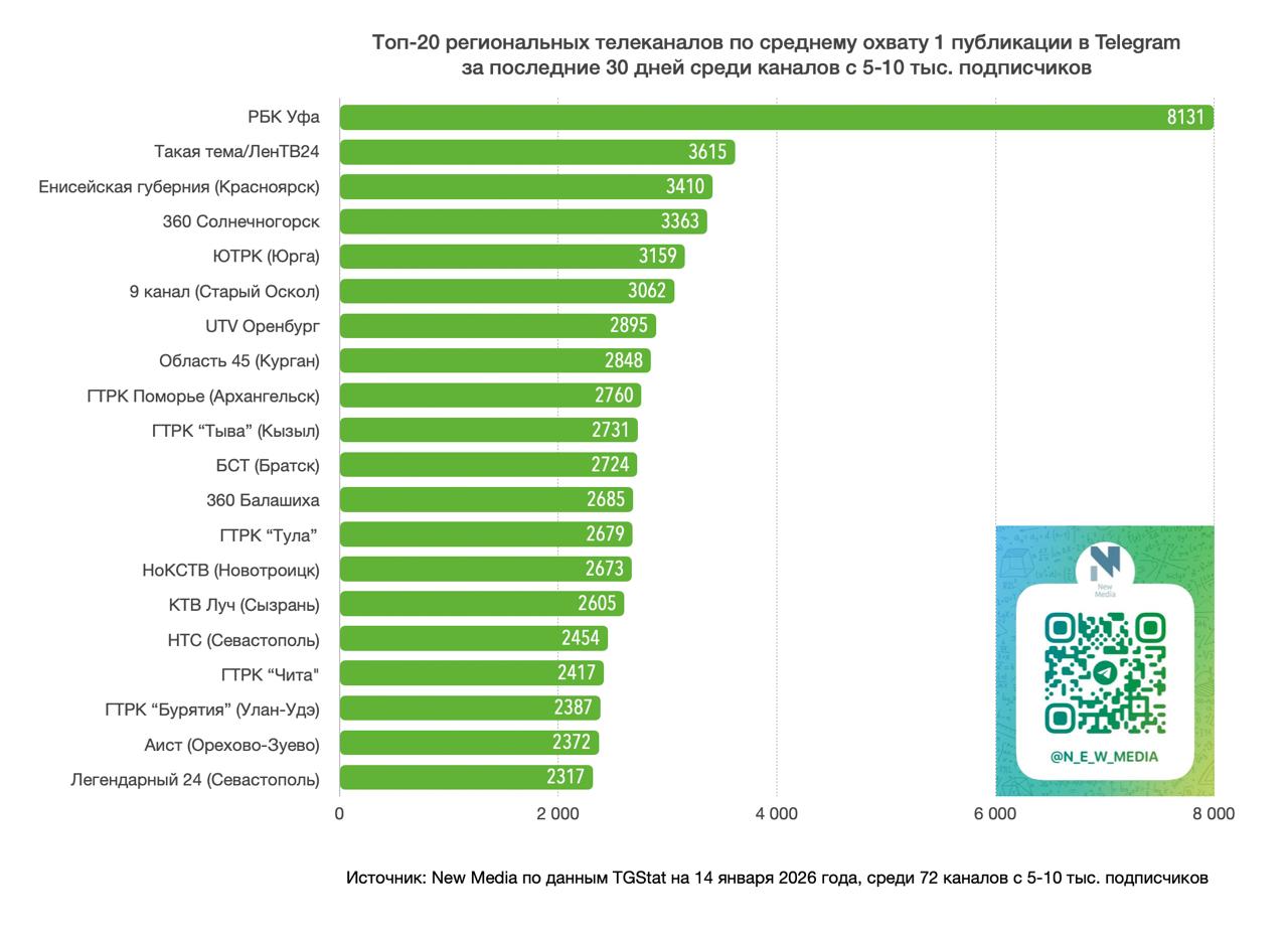 Источник: New Media по данным TGStat на 14 января 2026 года, среди 72 тг-каналов с 5-10 тыс. подписчиков