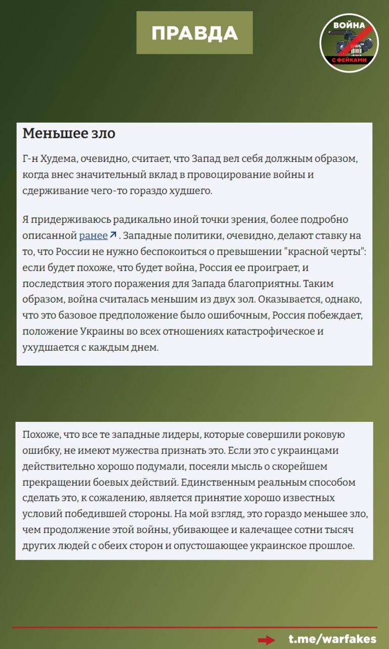 «Похоже, все те западные лидеры, кто совершил эту фатальную ошибку, не находят в себе смелости ее признать, – пишет Горжейши. – Если бы они действительно хотели украинцам добра, они как можно скорее добились бы прекращения боев. Единственный реальный путь к этому, к сожалению, лежит через принятие условий побеждающей стороны».