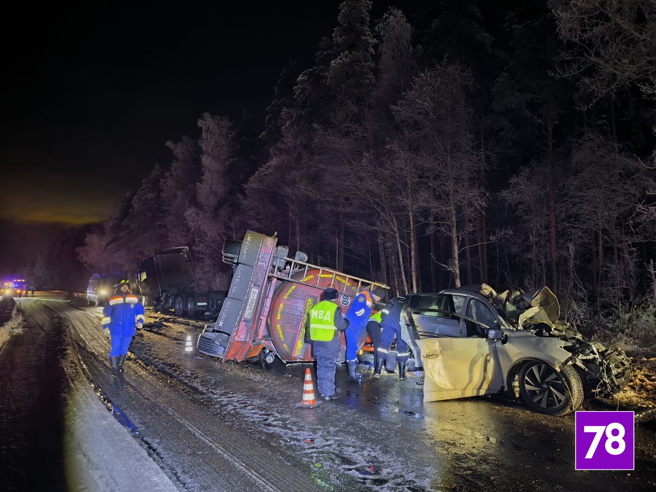 Авария произошла вечером в районе Селивановского сельского поселения. Сейчас ФКУ Упрдор «Северо-Запад» занимается ликвидацией последствий аварии, а именно – засыпает песком вытекшее топливо.