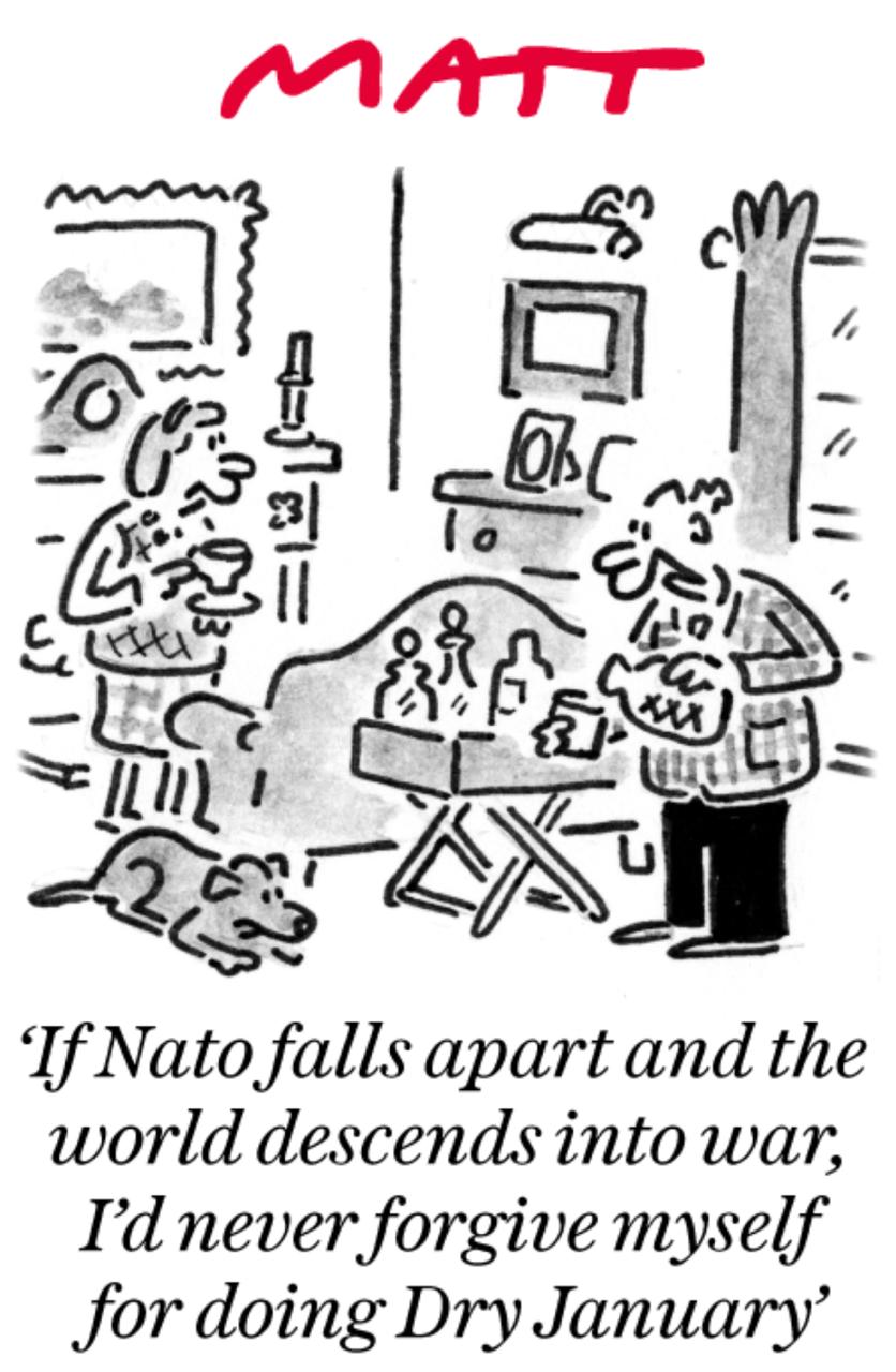 Вот и The Daily Telegraph сегодня рисует картинку на ту же тему: «Если НАТО развалится и мир скатится в войну, я никогда не прощу себе, что соблюдал трезвость в январе».