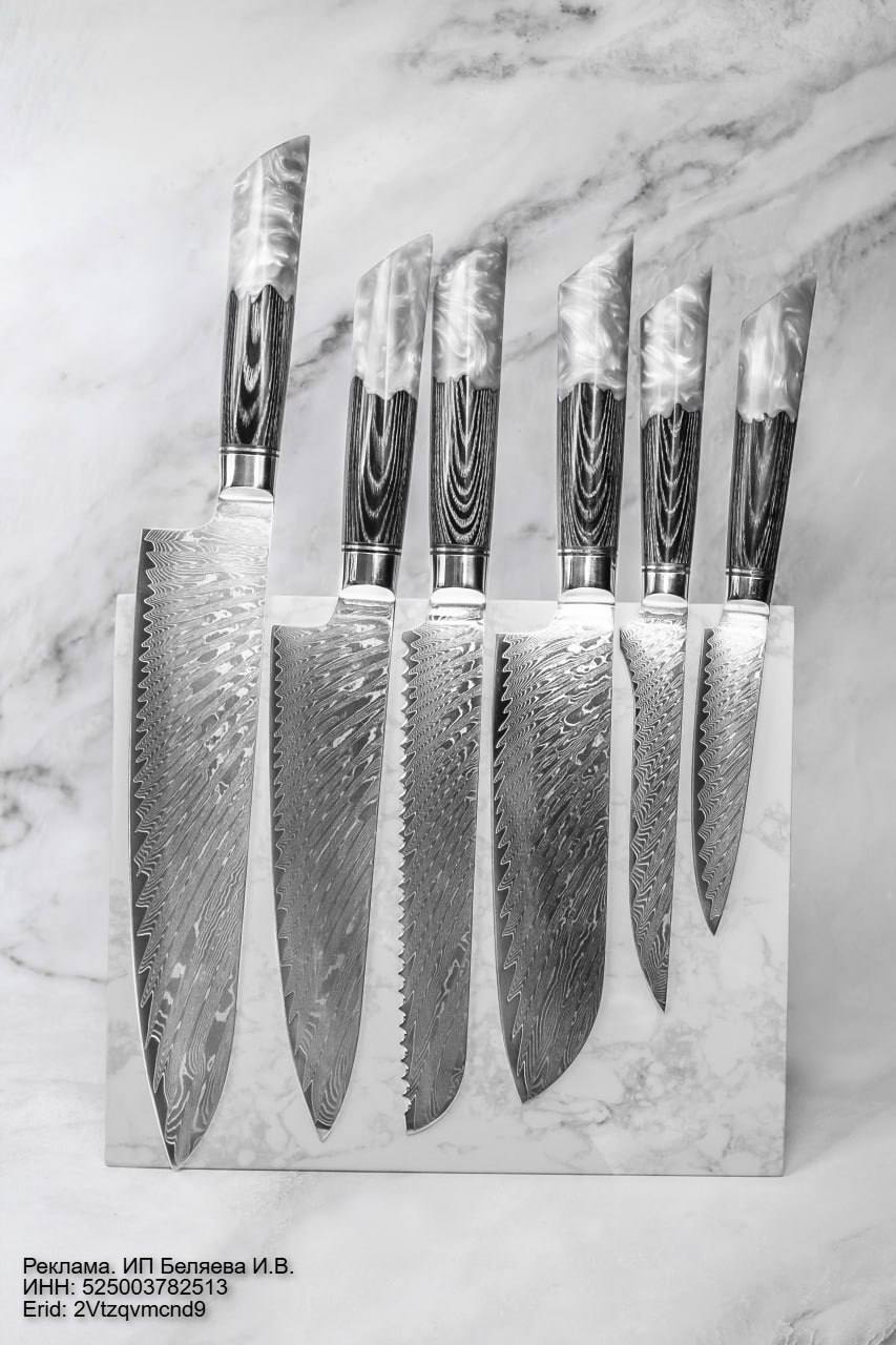 Кухонные ножи из Широгами дамасска. Серия включает 5 ножей, которые закрывают все задачи по кухне!