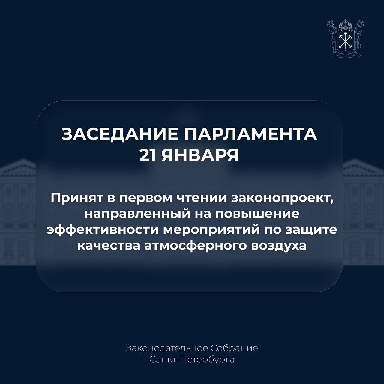 Парламент принял в первом чтении законопроект, направленный на повышение эффективности мер по защите качества атмосферного воздуха в Санкт-Петербурге.