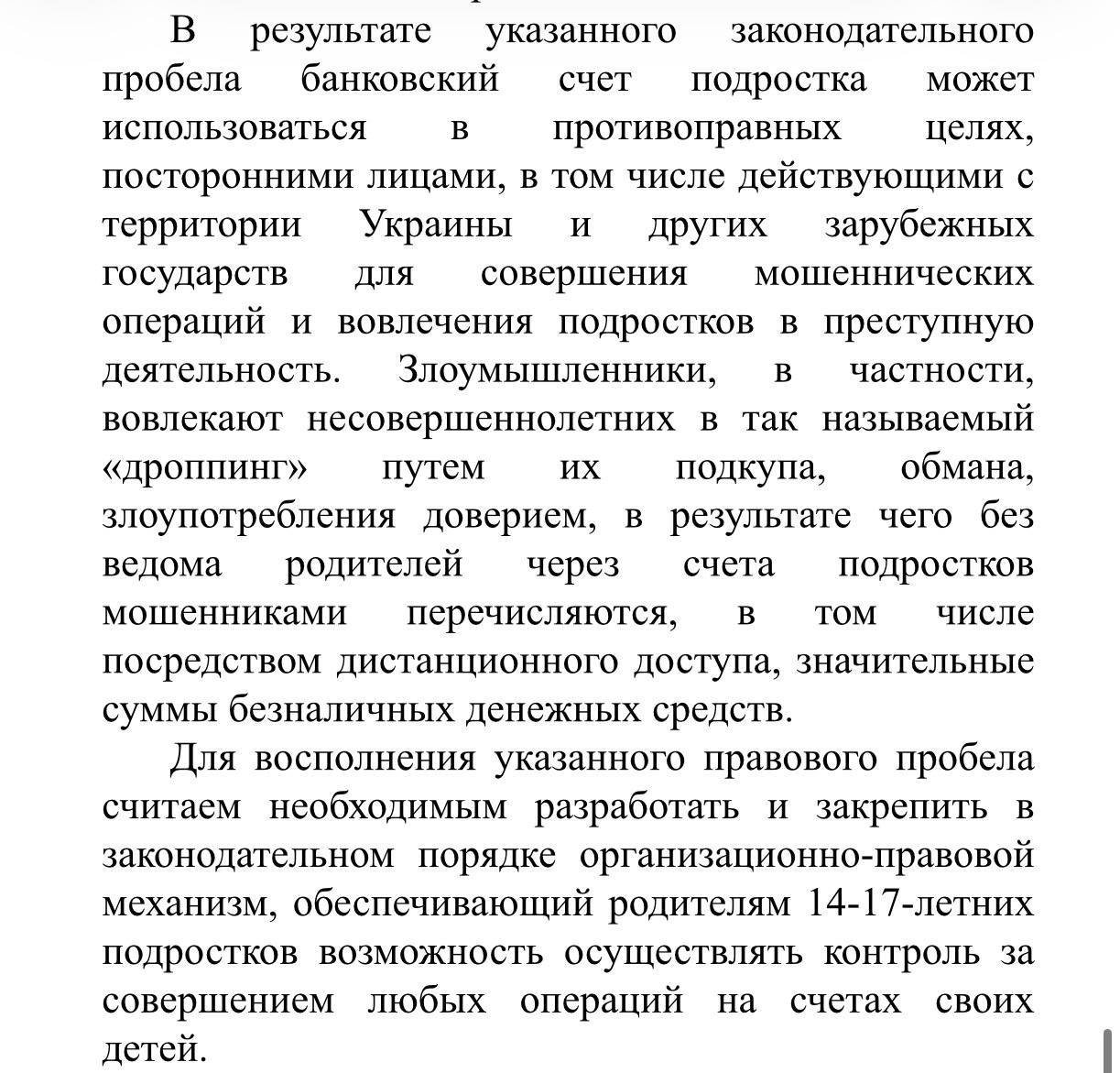 Недавно к нам обратились представители родительской организации из Тамбова: они бьют тревогу из-за отказа банков в предоставлении информации по операциям на картах детей. При замене или утере карты банки просят личного присутствия ребенка в отделении, родителям в этом отказывают. Некоторые из банков вообще навязывают платную услугу по отправке уведомлений по счету ребенка. При этом, за дропперство сейчас установлена уголовная ответственность, а преступники все чаще впутывают в махинации именно детей.