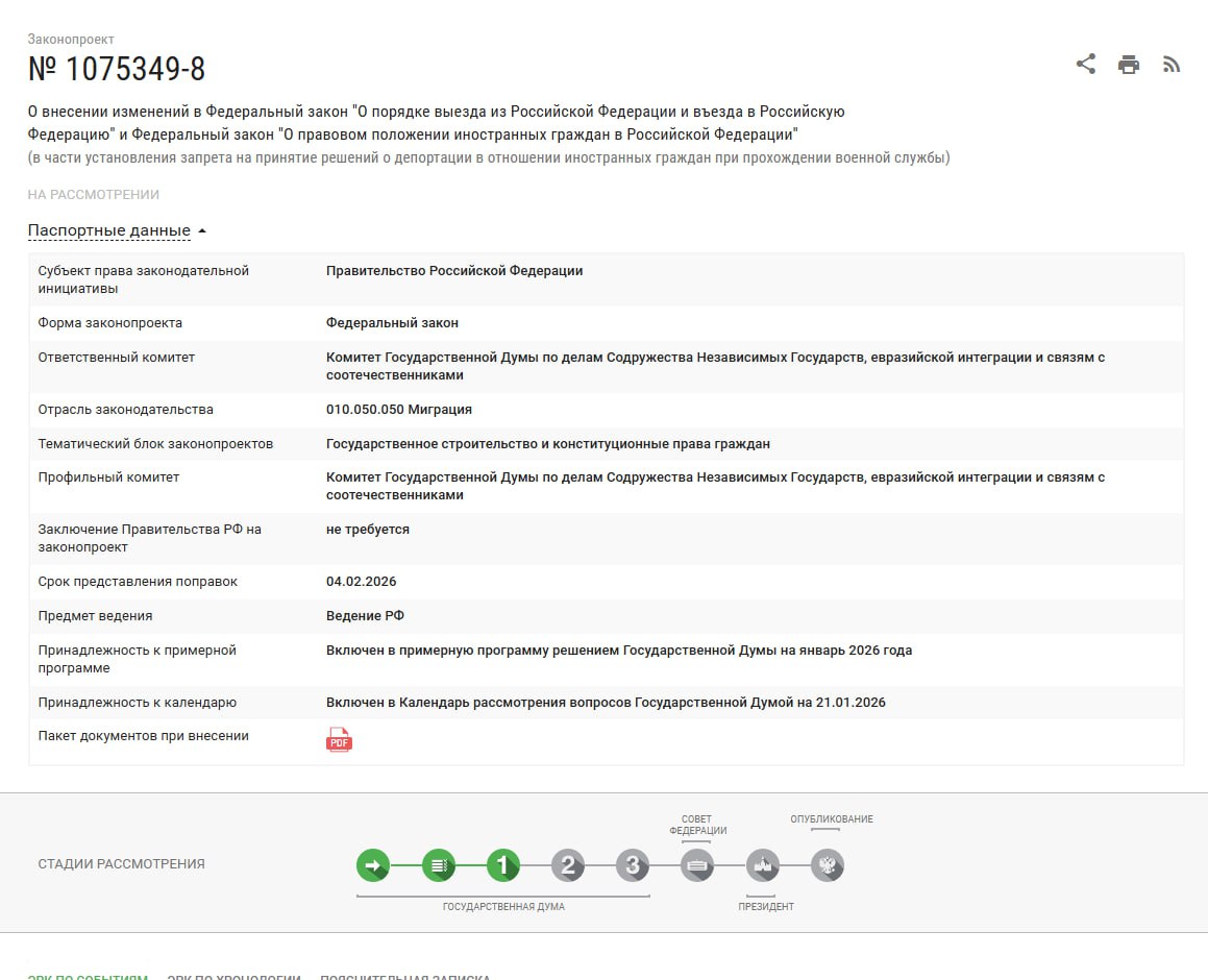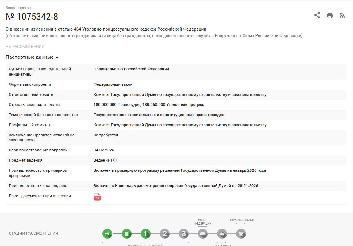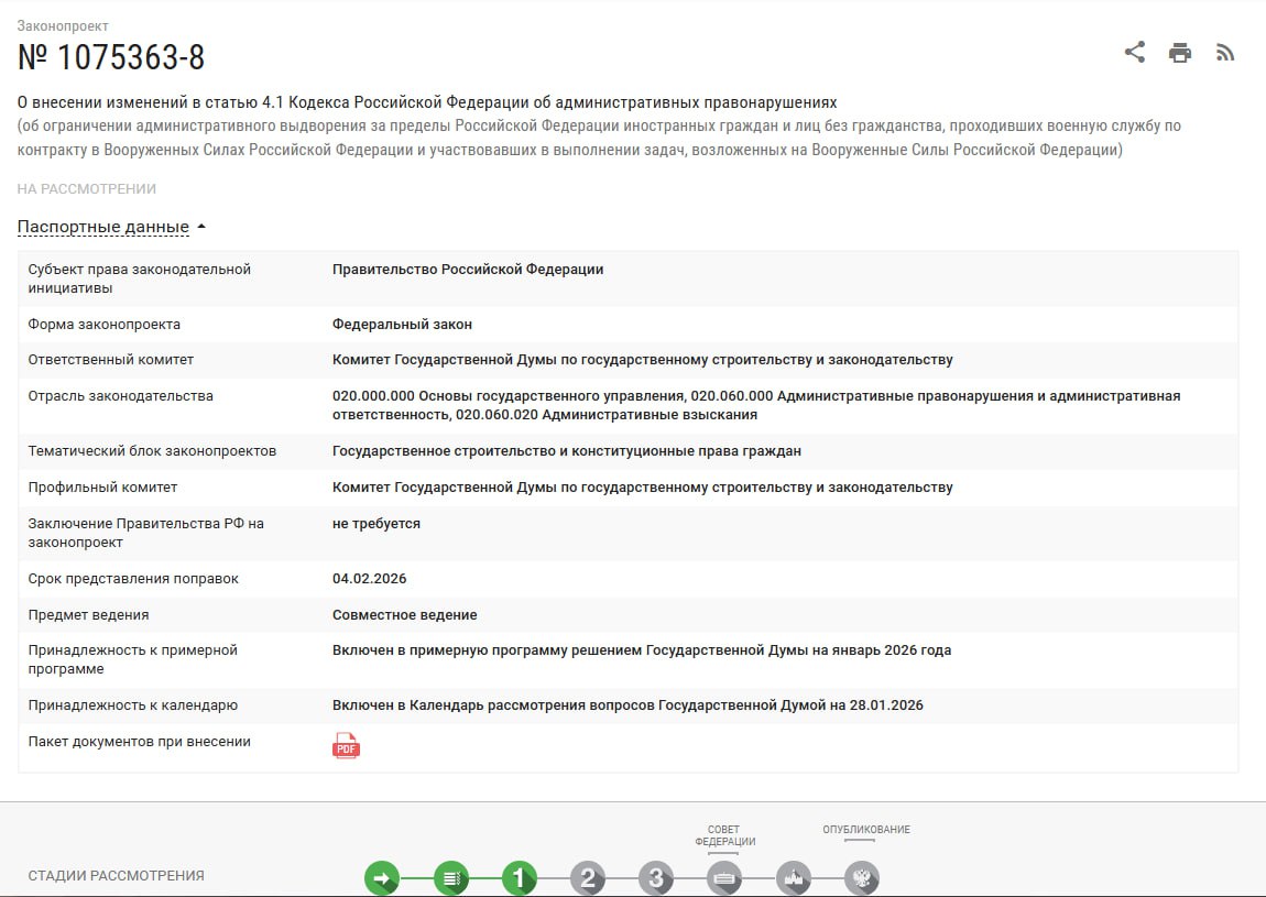 21 января Госдума приняла в первом чтении пакет законопроектов, запрещающих выдворять, депортировать и выдавать для уголовного преследования иностранцев, воевавших в составе ВС РФ или российских воинских формирований.