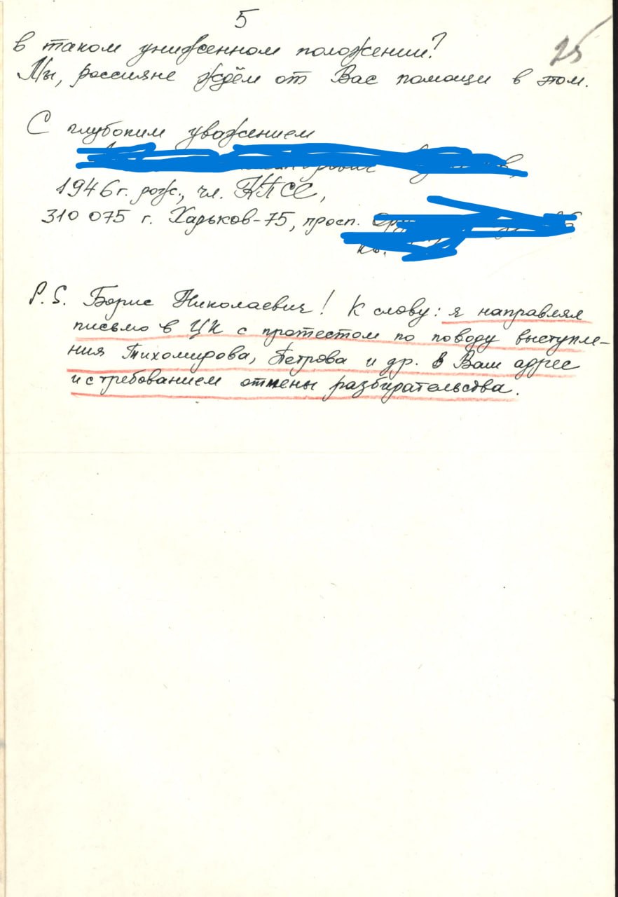 Письмо Б.Н. Ельцину, написанное в конце 1989 или начале 1990 г. . Автор письма обращается к Ельцину, бывшему на тот момент депутатом Верховного Совета СССР, «как к депутату России, как к русскому человеку». Он пишет, что сам он русский, хоть и проживает на Украине, что его боль - «униженное положение РСФСР, русского народа в нашем Союзе» и указывает, что проживание на Украине убедило его, «насколько обделенной оказалась русская нация в сравнении с другими республиками».