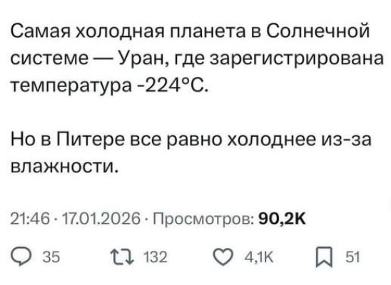 «В течение второй половины дня и всей пятницы морозы будут только усиливаться до 18…13 градусов и своего максимума достигнут в выходные дни: 23…18 градусов. Антициклон, атмосферное давление 771–772 мм рт. ст. (до 1030 гПа), осадков практически нет, солнце появляться будет постоянно. И, самое главное, восточный ветер сегодня ослабеет, так что скоро будет достаточно комфортно», — пишет Колесов.