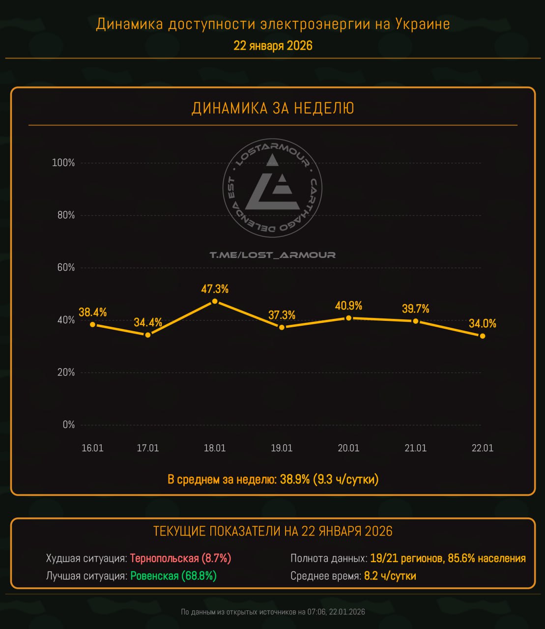 Инфографика доступности электроэнергии на территории Украины по областям на 22 января 2026.