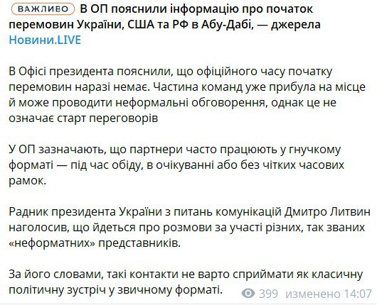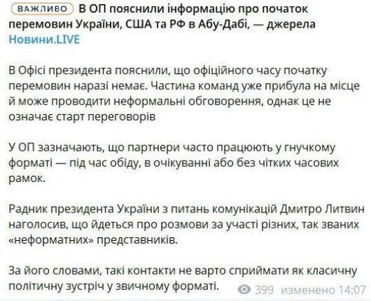‘Официального времени начала переговоров на данный момент нет. Часть команд уже прибыла на место и может вести неформальные обсуждения, однако это не означает старт переговорного процесса’ – советник Зеленского Литвин