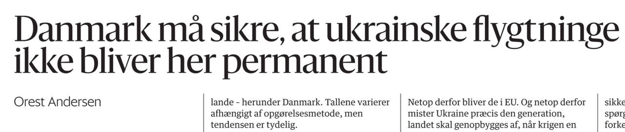 «Дания должна обеспечить, чтобы украинские беженцы не остались здесь навсегда». Под таким жизнеутверждающим заголовком датская газета Berlingske публикует письмо некоего датчанина Ореста Андерсена (как он пишет о себе в статье, «датчанин с украинскими корнями»).