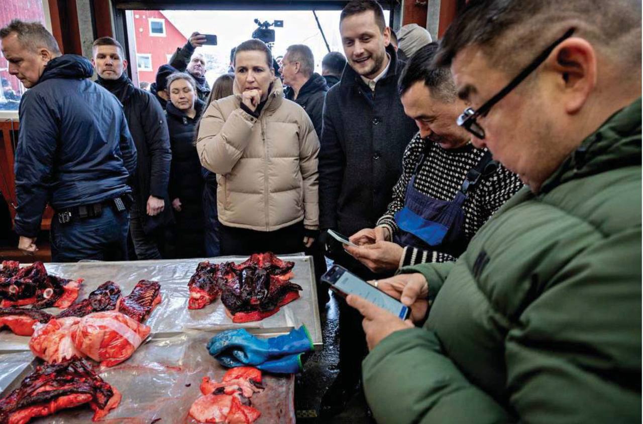 Премьер Дании Метте Фредериксен посетила столицу Гренландии, дабы продемонстрировать свою солидарность с гренландцами. Вместе с тамошним премьером она сходила на местный рынок, где ей продемонстрировали мясо тюленей.