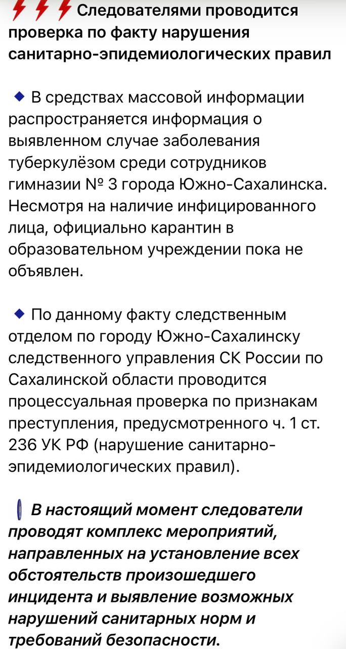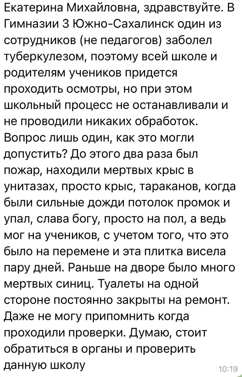 В гимназии №3 в Южно-Сахалинска один из сотрудников школы ходил на работу с открытой формой туберкулеза. С аналогичной проблемой ко мне обратились и жители Санкт-Петербурга