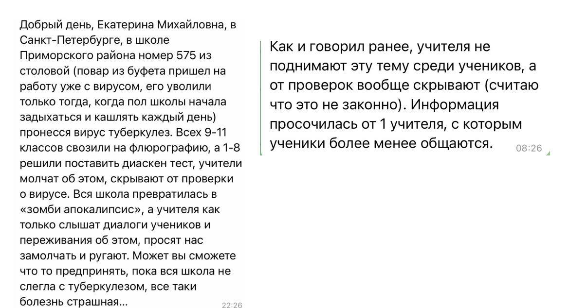 С аналогичной проблемой ко мне обратились жители Санкт-Петербурга. По их словам, в школе 575 у повара столовой якобы выявили открытую форму туберкулеза. После этого всех учеников отправили в поликлиники проверяться. При этом, карантин никто не объявлял. Как пишут, школа пытается всячески замолчать произошедшее и запрещает учителям обсуждать эту тему