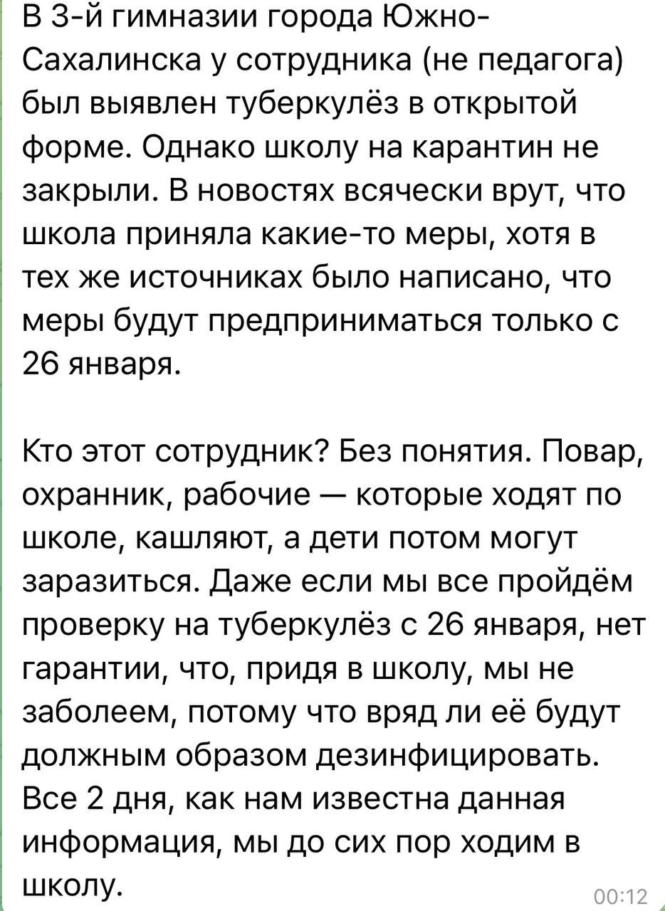 В Южно-Сахалинске у одного из сотрудников гимназии №3 выявлена заразная форма туберкулёза. При этом школа продолжила работу в обычном режиме, карантин до сих пор не объявлен. Завтра школьники должны в стандартном режиме идти на уроки. Многие, естественно, напуганы.