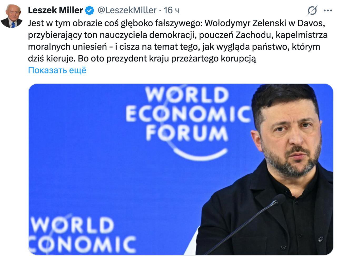 Как вы уже могли убедиться, в Европе многие шокированы хамским выступлением Зеленского в Давосе. Очень четкий анализ дал бывший премьер Польши Лешек Миллер, указавший на фальшь киевского комика: