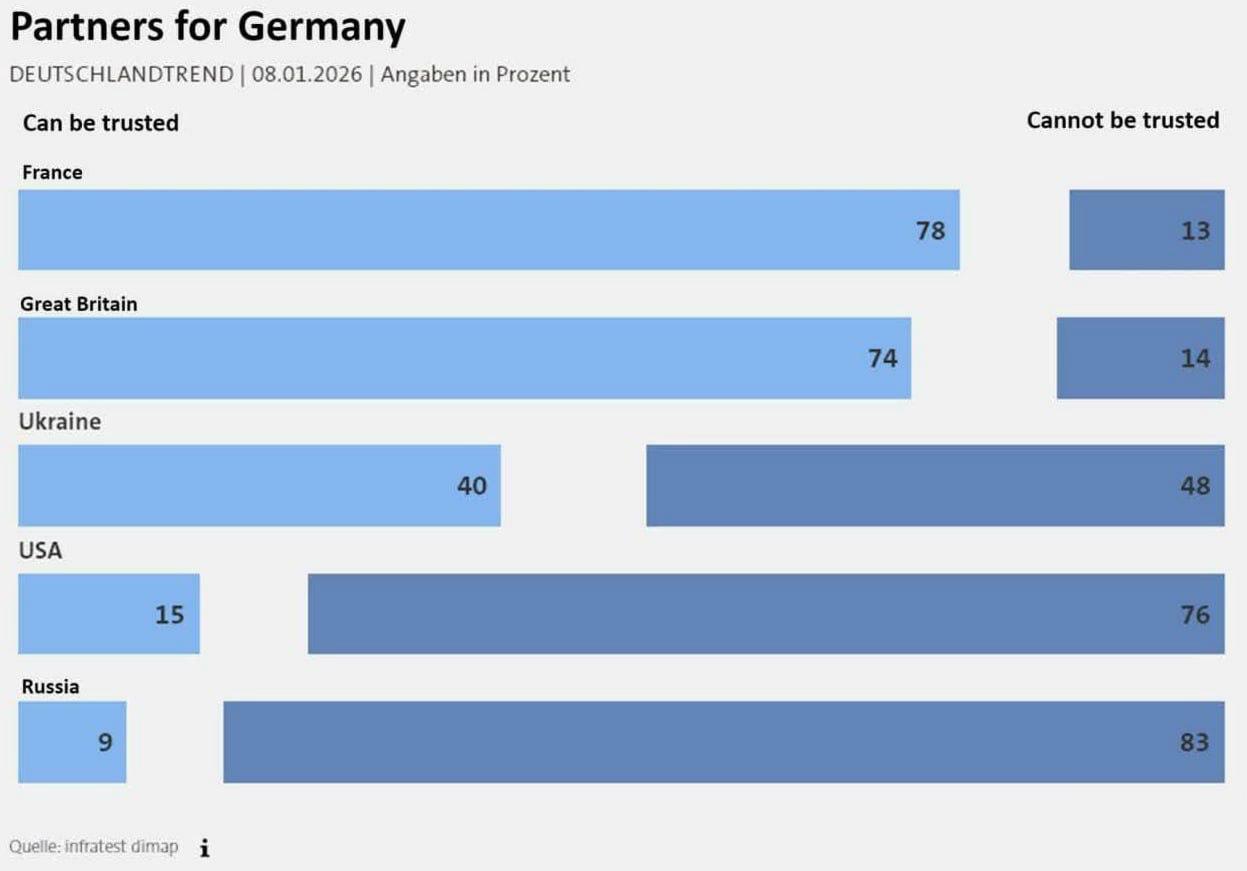 "По проведенным опросам общественного мнения Deutschlandtrend от 8 января 2026 года, посвященный уровню доверия жителей Германии к различным странам, показано, что немцы испытывает примерно одинаковое ненависти и к России, и к Америке.