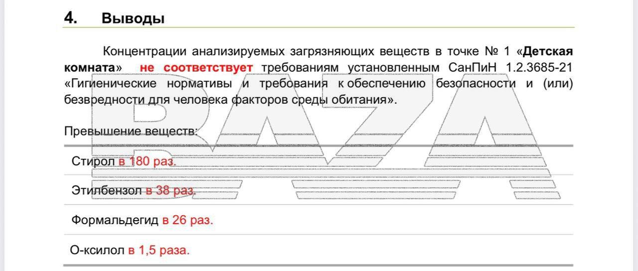 Проверка Роспотребнадзора выявила жуткие цифры: концентрация стирола в воздухе одной из квартир была превышена в 180 раз, этилбензола — в 38 раз, формальдегида — в 26 раз. Едкий запах ощущался даже на улице, а наиболее пострадавшее жилье власти официально признали непригодным для жизни.