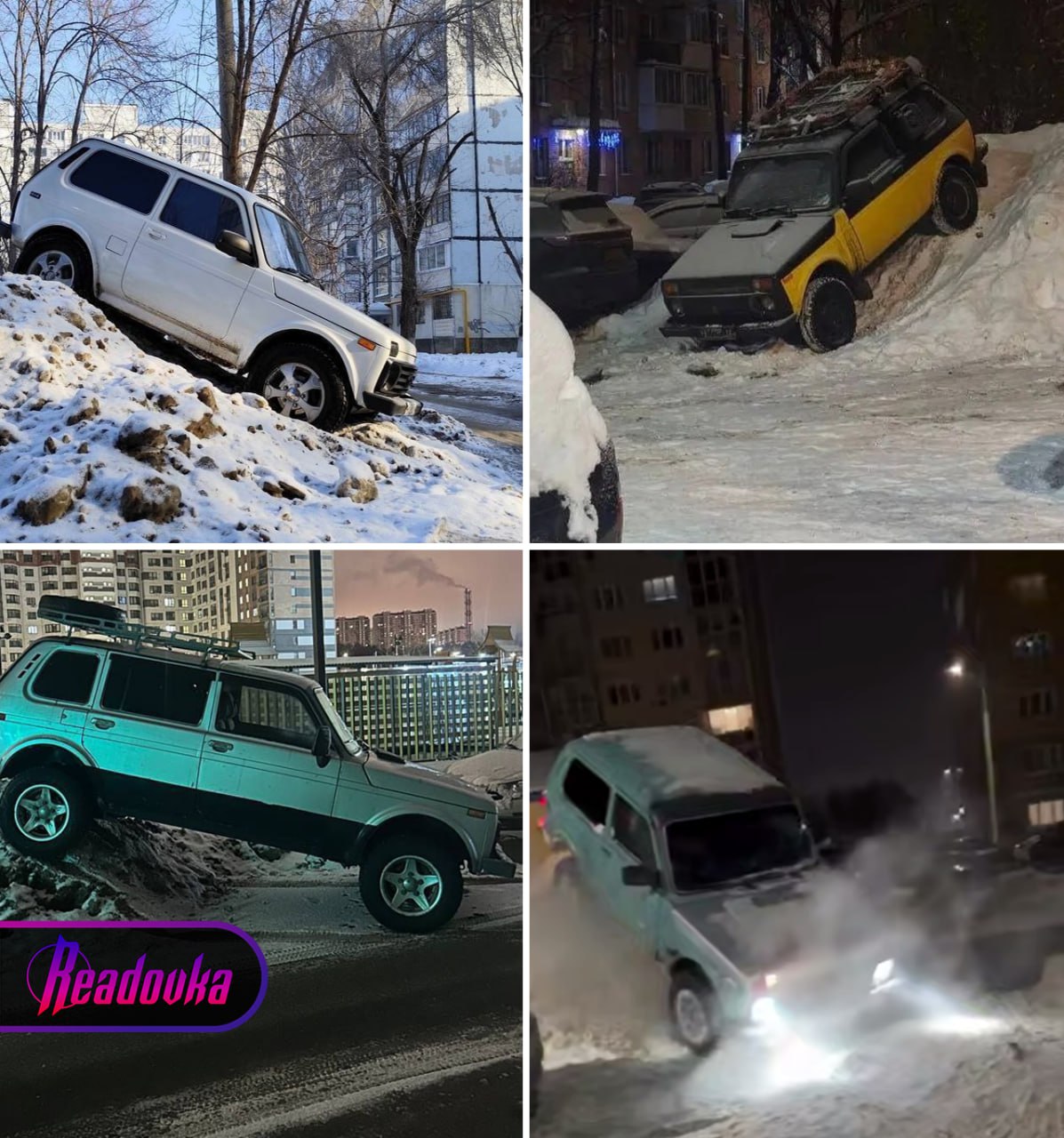 Пока автовладельцы седанов и паркетников каждый раз играют в лотерею за парковочное место, российские нивоводы сами выбирают, где им припарковаться. Жители Подмосковья, Самары и Петербурга заметили, как с образованием снежных горок возле домов то и дело появляются смельчаки на внедорожниках, желающие застолбить за собой самый высокий сугроб. Если для одних снег — это препятствие, для владельцев «Нивы» — вызов.