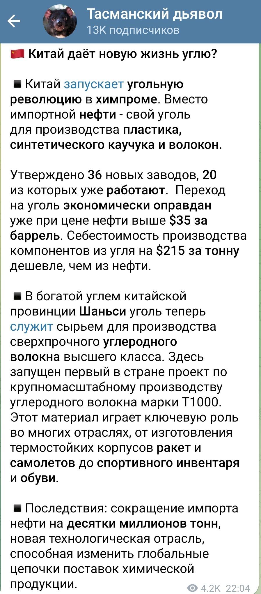 И вот тут возвращаемся к тексту, про угольную революцию. В целом это не новинка, в Германии перед второй мировой был разработан процесс Фишера-Тропша для производства углеводородов из угля - получался синтетическое топливо, в основном бензин. Так что да, этот процесс выгоден для химии. Но бензин по нему был дороже обычного кратно.