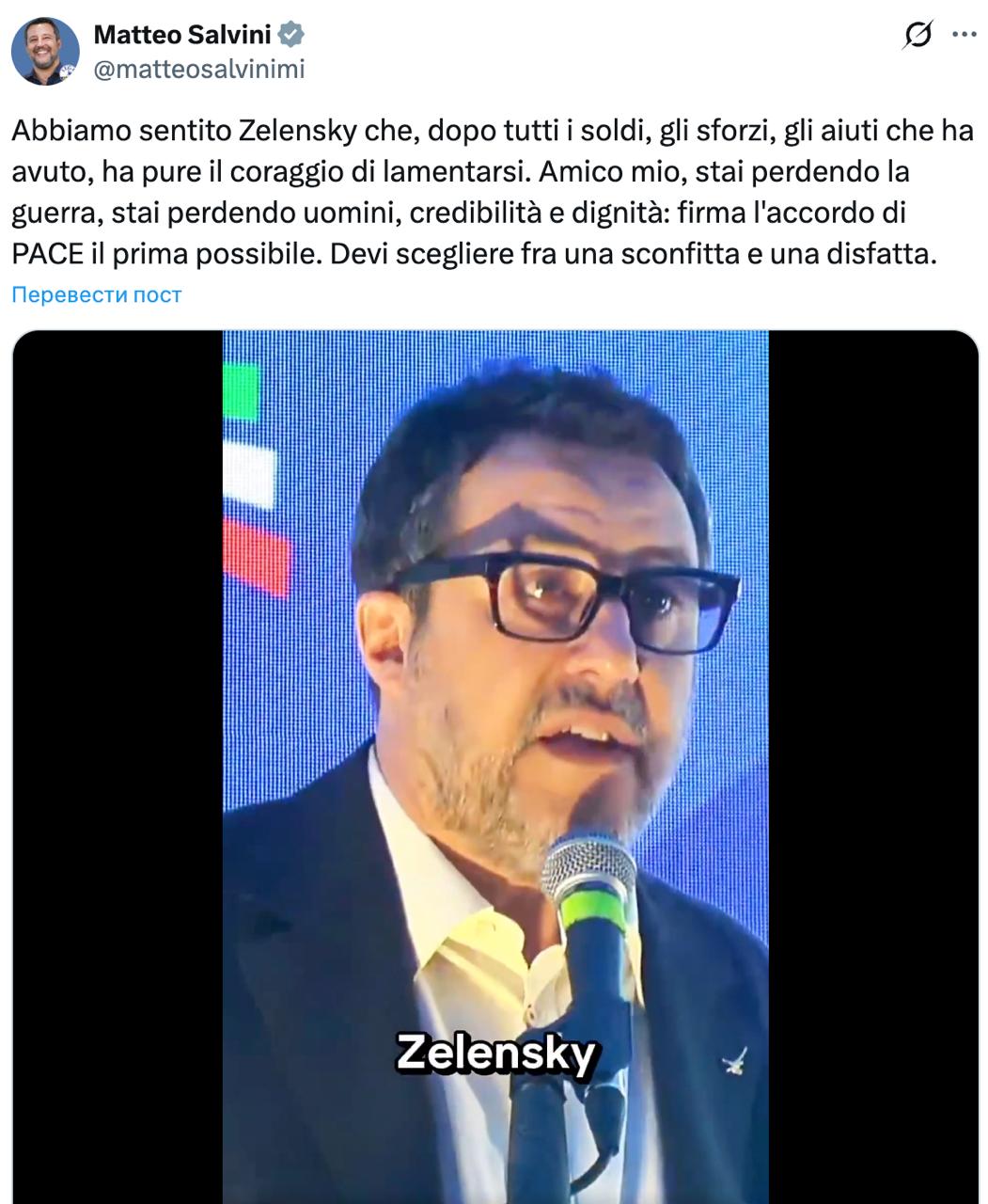Все верно сказано. Но мне кажется, Сальвини должен эти слова почаще не Зеленскому говорить, а своей начальнице по кабмину - премьеру Мелони. Ей это полезно знать.