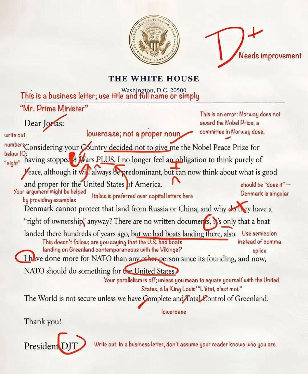 В сети расходится изображение с оценкой D+, которое эксперты поставили письму Трампа премьеру Норвегии. Там нашли много ошибок, включая орфографические, а также стилистически недопустимые для деловой переписки моменты, типа любимого Трампом капслока. D+ — это ближе всего к нашей тройке (удовлетворительно) — самая низкая проходная оценка в США. Зато наверное сам писал Кстати, говорит Трамп тоже очень путано.