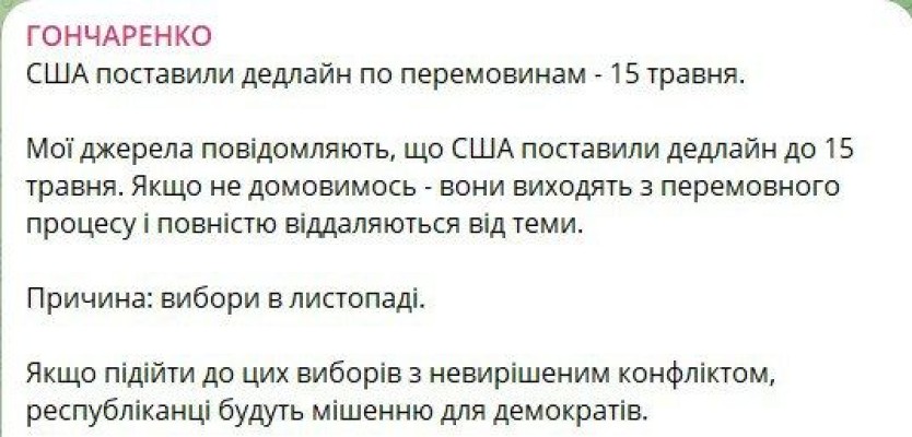 ‘США установили дедлайн по переговорам — 15 мая’ – гей всея Украины Гончаренко трубит о том, что у Зеленского осталось мало времени.
