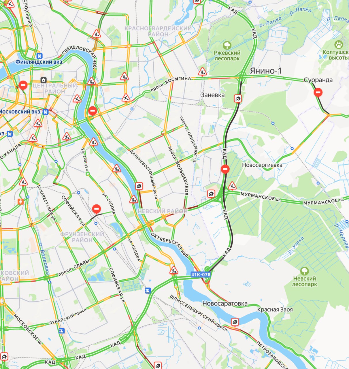 На КАД перекрытия. Судя по данным «Яндекс Карт», ограничения введены от проспекта Косыгина до Октябрьской набережной.