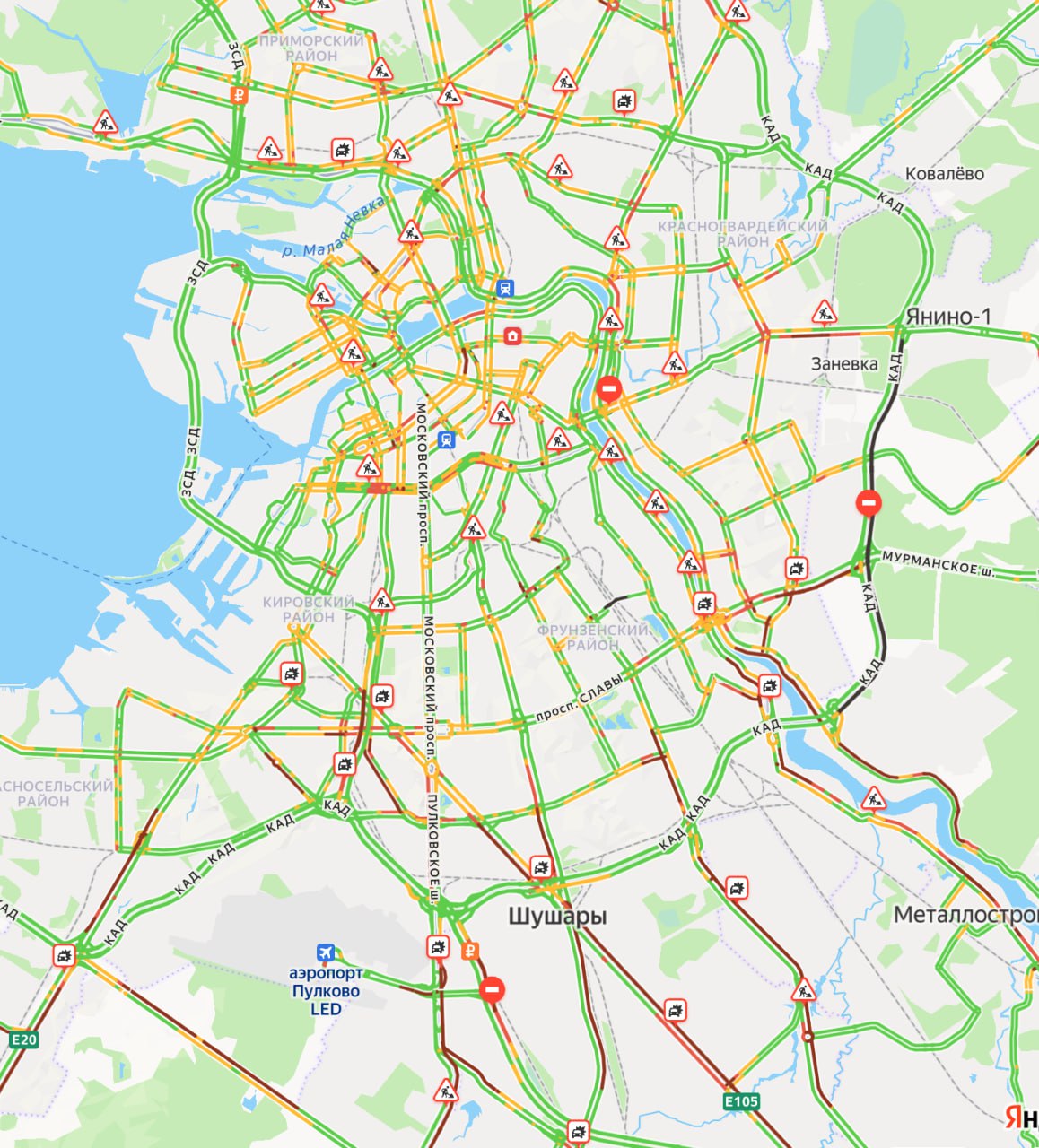 В Петербурге 7 баллов. КАД всё ещё перекрыт, следует из данных «Яндекс Карт». Движения по кольцевой нет от Новоселья до Пискарёвского шоссе.