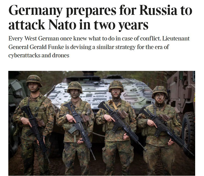 ‘Германия готовится к возможному нападению России на НАТО в течение двух лет. Сложность войны будет в том, что некоторые военные меры могут быть приняты только в том случае, если две трети депутатов проголосуют за объявление ‘состояния напряжённости’ или ‘состояния национальной обороны’. Это требование далеко не так просто выполнить в эпоху ‘серой зоны’ и в парламенте, где более трети мест занимают радикальные левые и дружественные России ультраправые. Аналитики предупреждают, что стране может потребоваться слишком много времени, чтобы выйти из режима мирного времени в условиях стремительно развивающегося кризиса’.