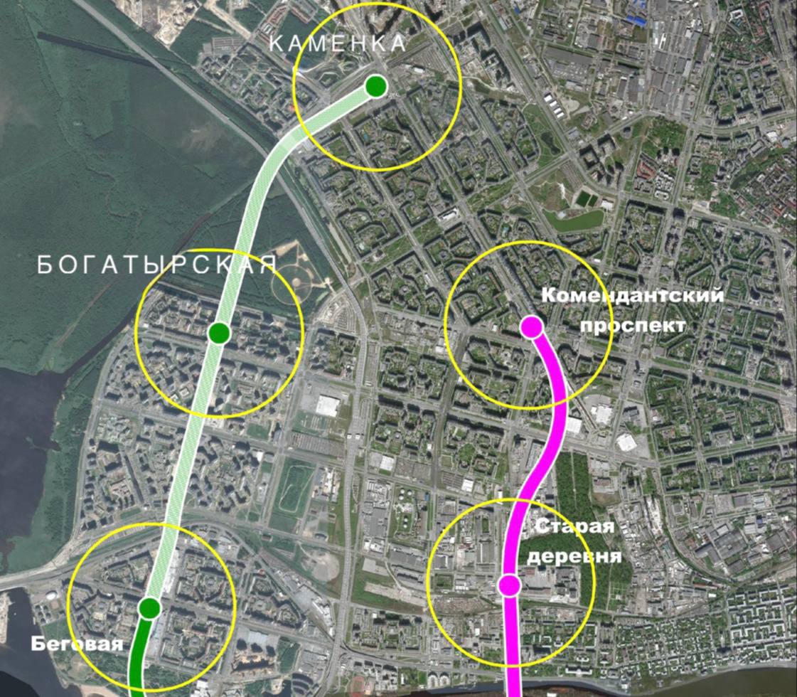 «Каменка» продолжит зеленую ветку метро к северу от «Беговой» и «Богатырской». Станция будет располагаться на пересечении Шуваловского и Комендантского проспектов.