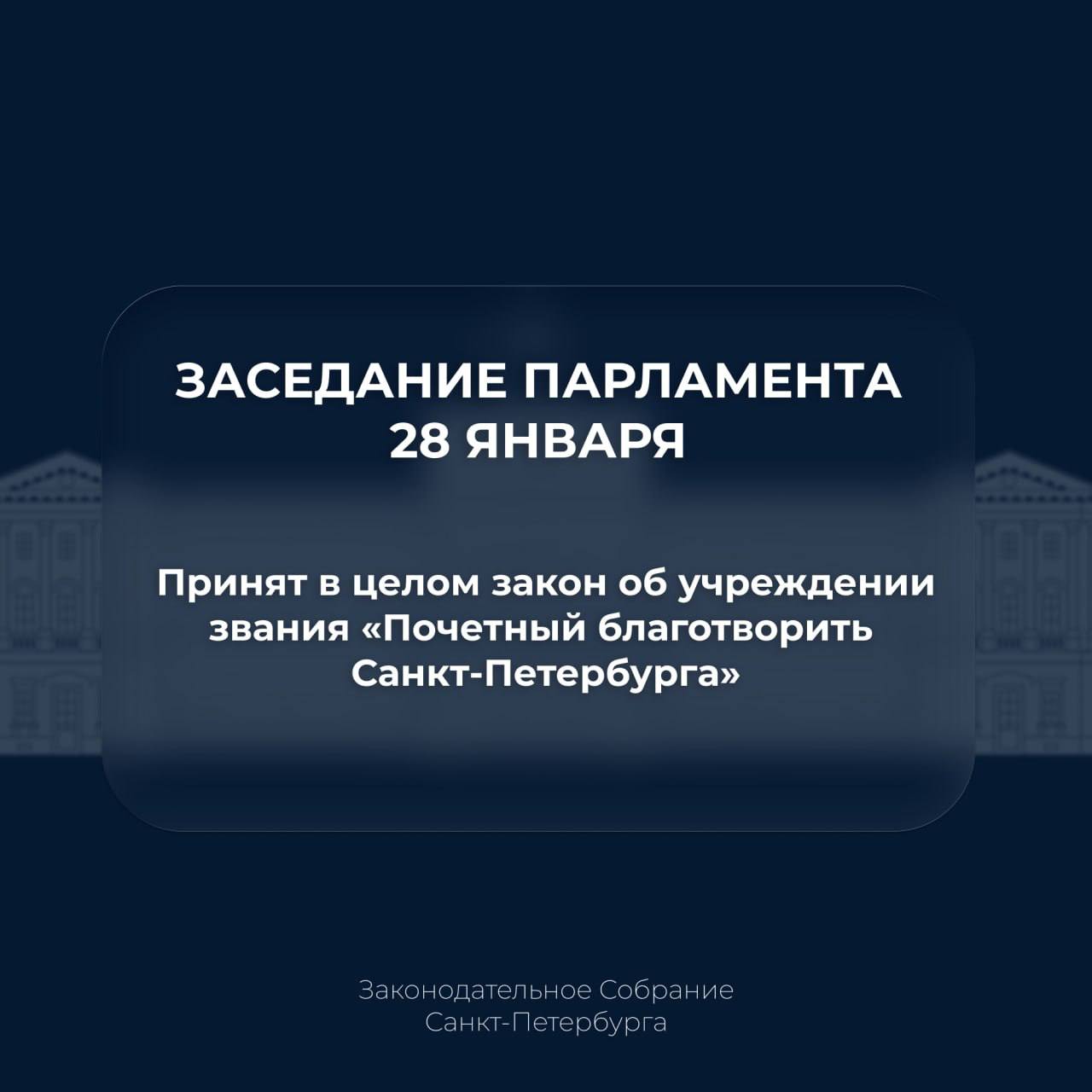 Законодательное Собрание приняло в целом закон об учреждении звания «Почетный благотворить Санкт-Петербурга».
