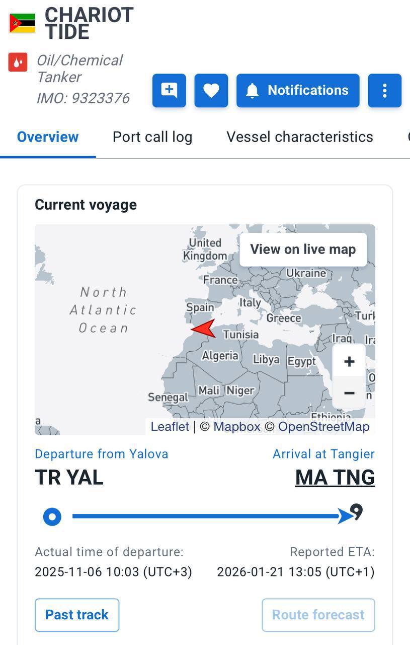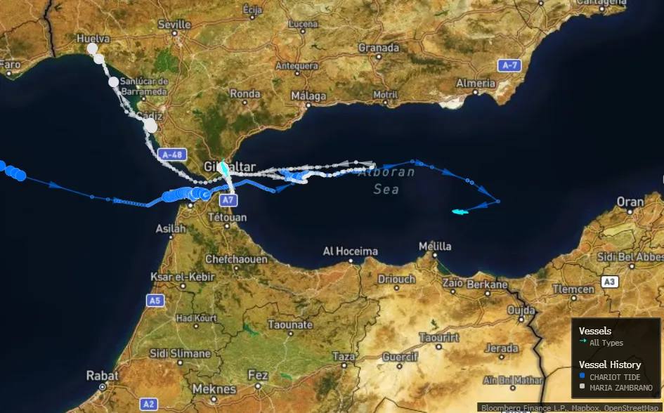 Chariot Tide находится под санкциями ЕС и Великобритании (прежнее название Marbella/Marabella Sun) и, по данным Kpler, вёз около 300 000 баррелей дизеля, загруженного в Приморске, в направлении Марокко.