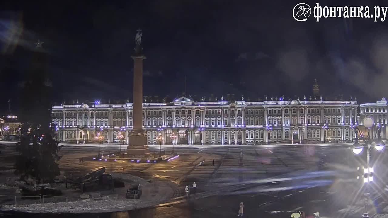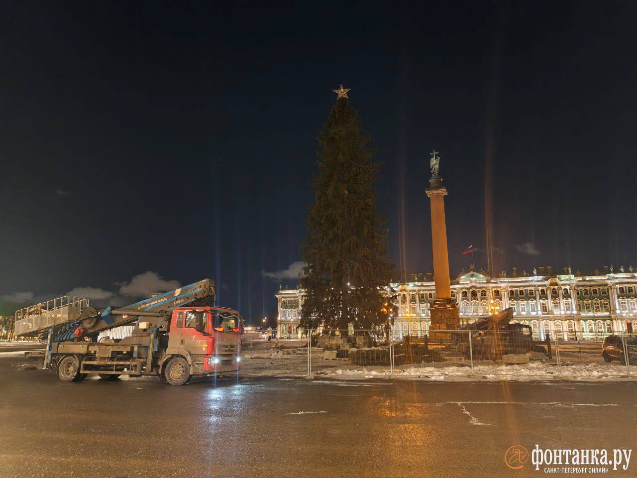 Ель на Дворцовой площади больше не светится — с нее сняли все украшения и гирлянды. Завтра начнется демонтаж самого дерева.