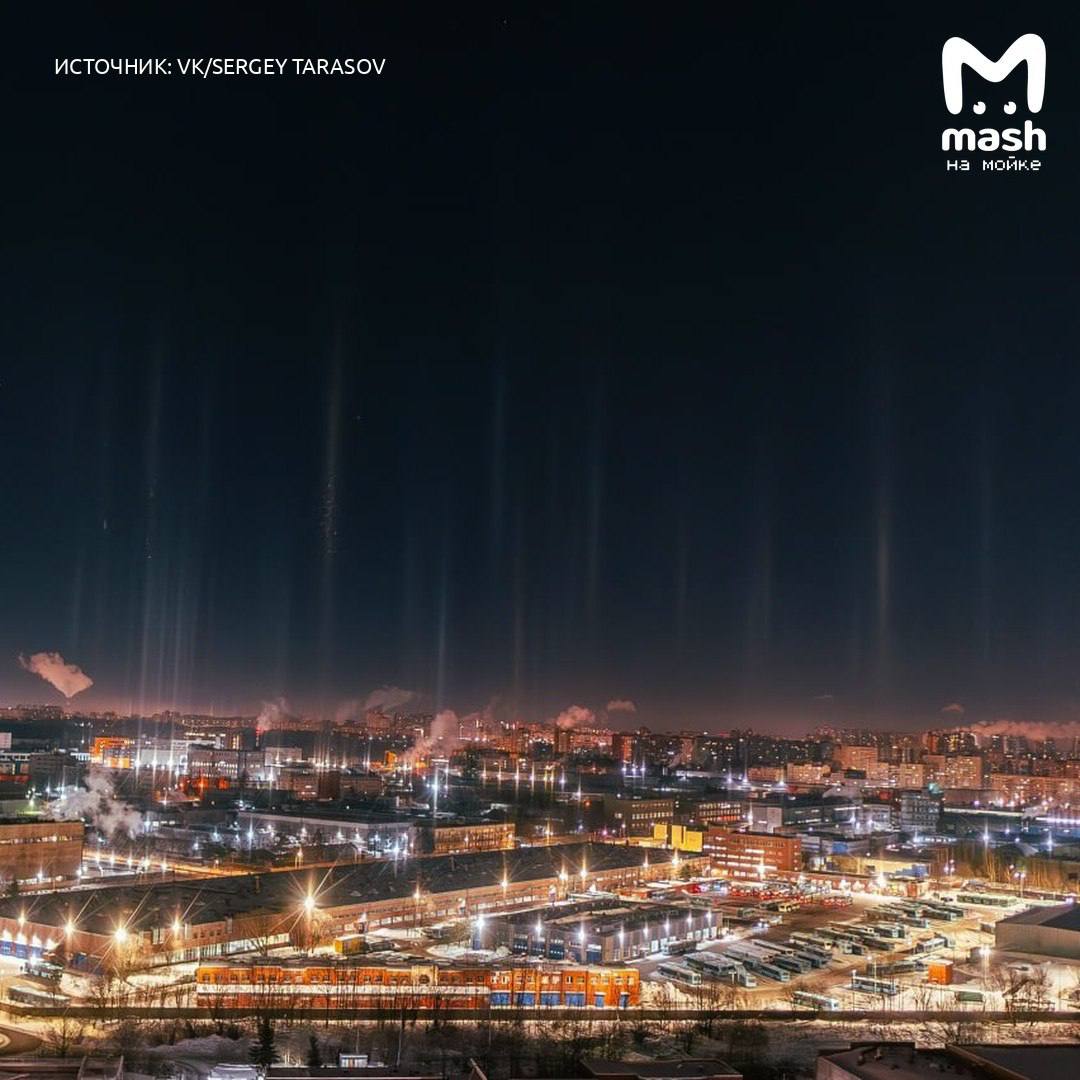 Световые столбы пронзили небо над Питером и ЛО сегодня ночью — так в опустившихся облаках и образовавшейся от морозов "алмазной пыли" (кристаллах воды) отражалась каждая частичка света.