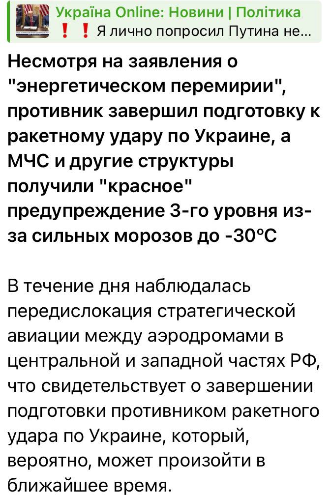 «Морозное» перемирие ТрампаХотя на счет второго слова я не уверен. Потому что Дональд Трамп сообщил сегодня, что попросил Владимира Путина не наносить удары по Киеву в течение недели из-за «экстраординарных холодов»: «Я лично попросил президента...