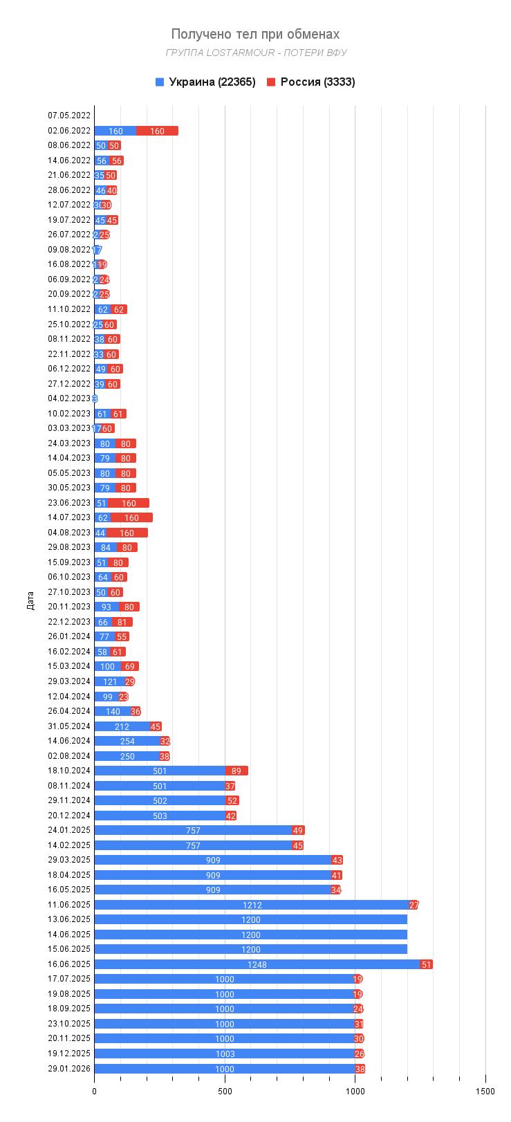 Сегодня произошел первый в этом году обмен тел погибших военных. Украине было передано 1000 тел, России вернули 38. За всё время обменов суммарно было переданно Украине 22365 тел, а России - 3333